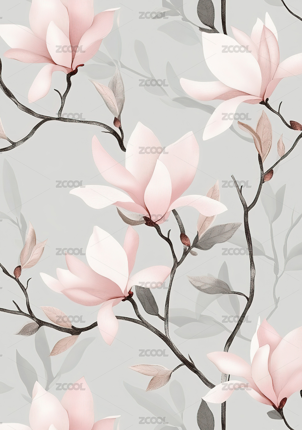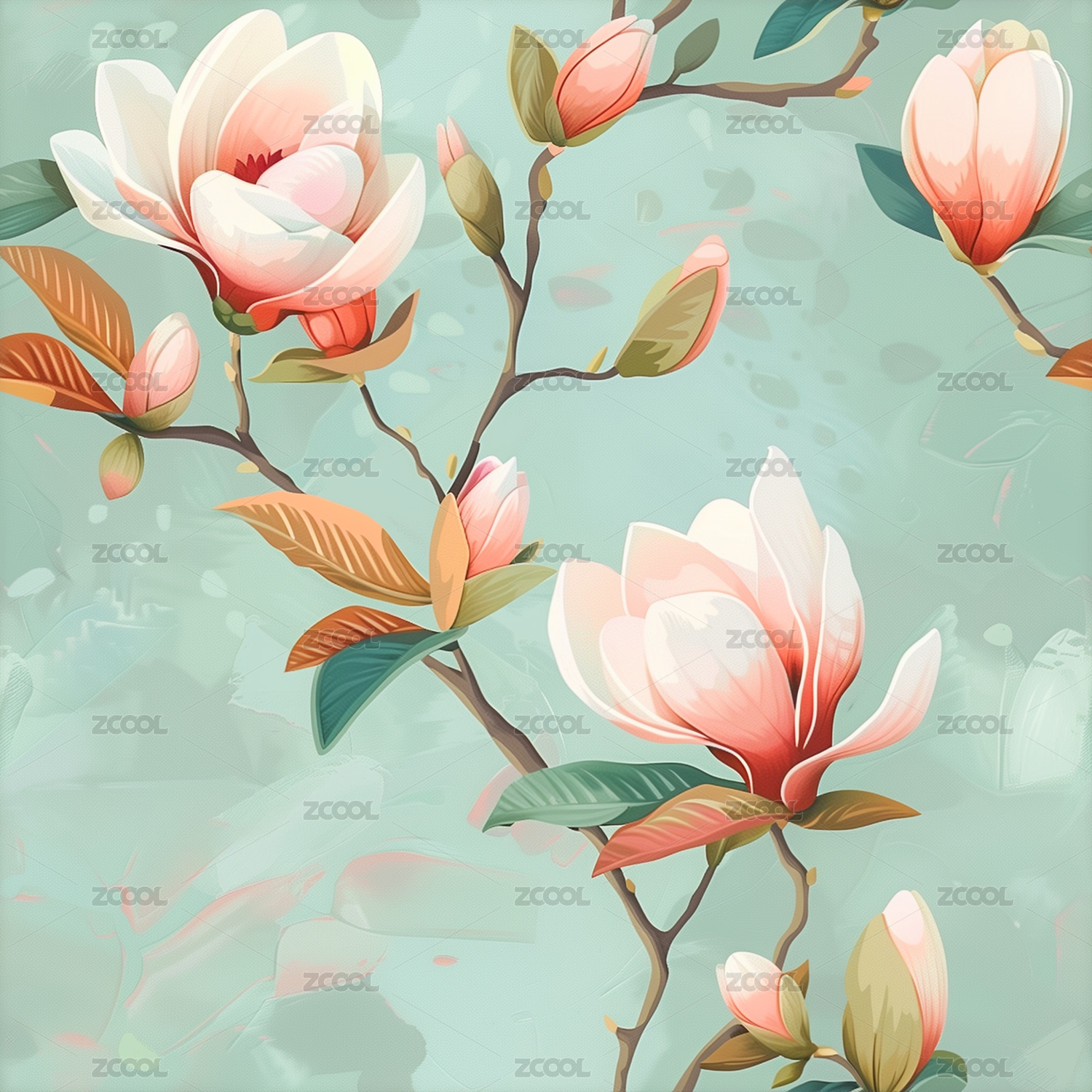 清新典雅带枝条的玉兰四方连续无缝拼接背景