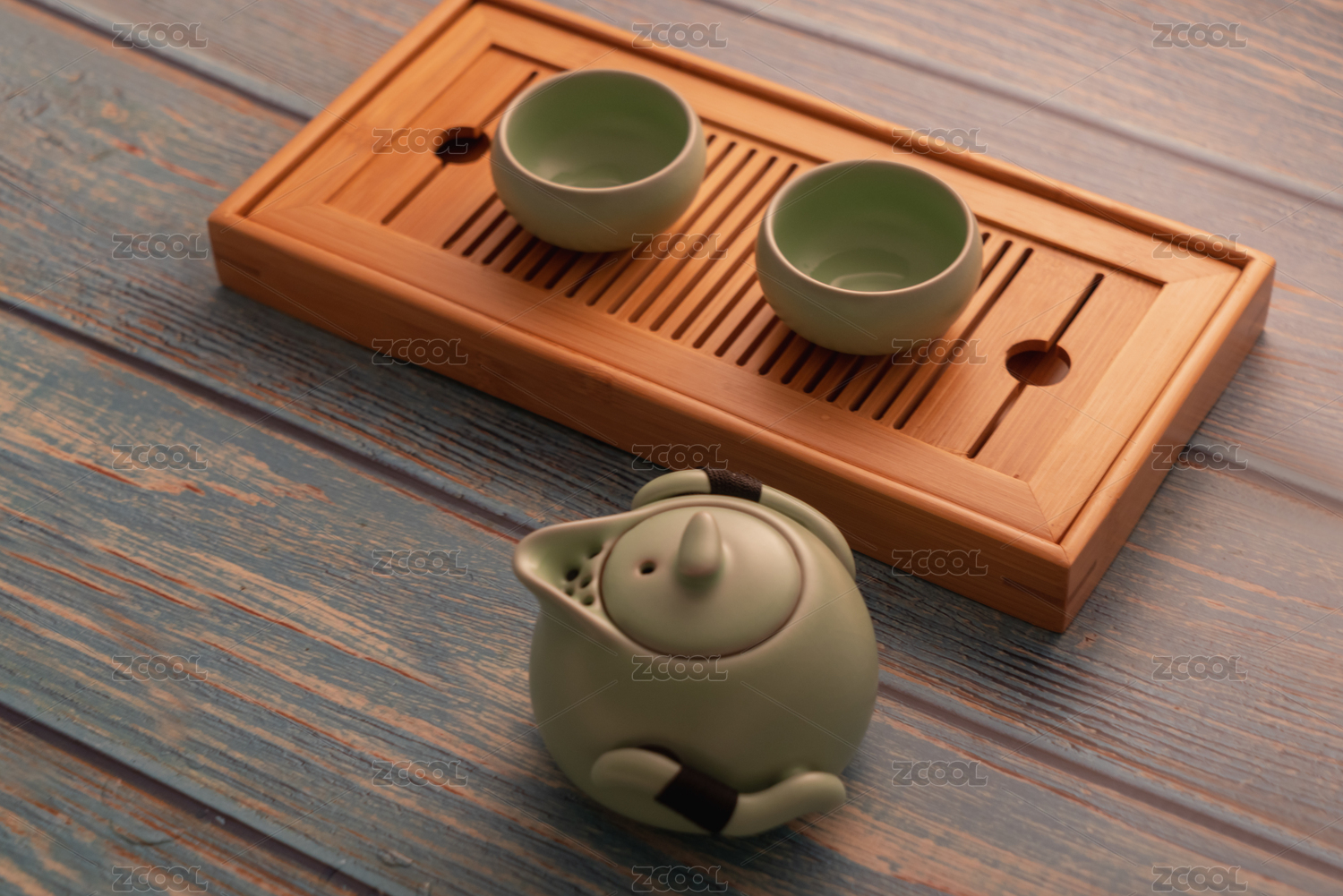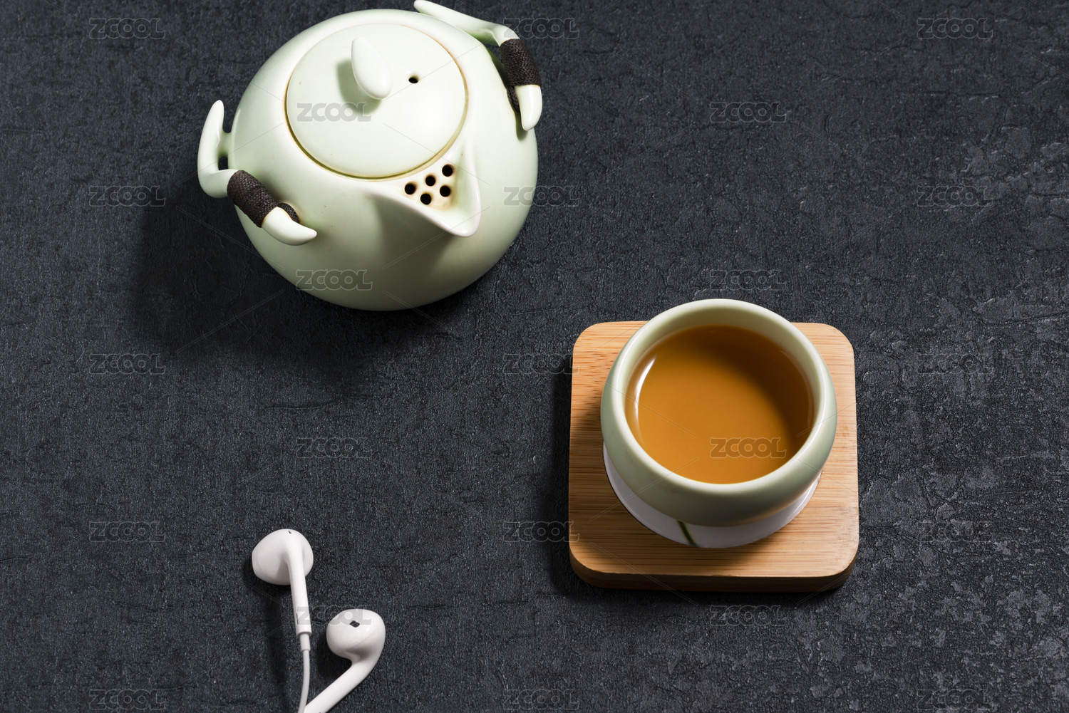 深色桌面上随意摆放的青瓷茶壶茶杯及耳机