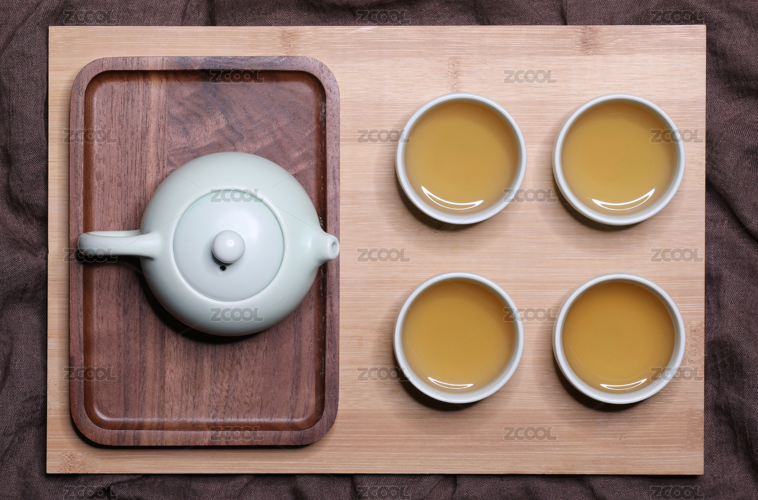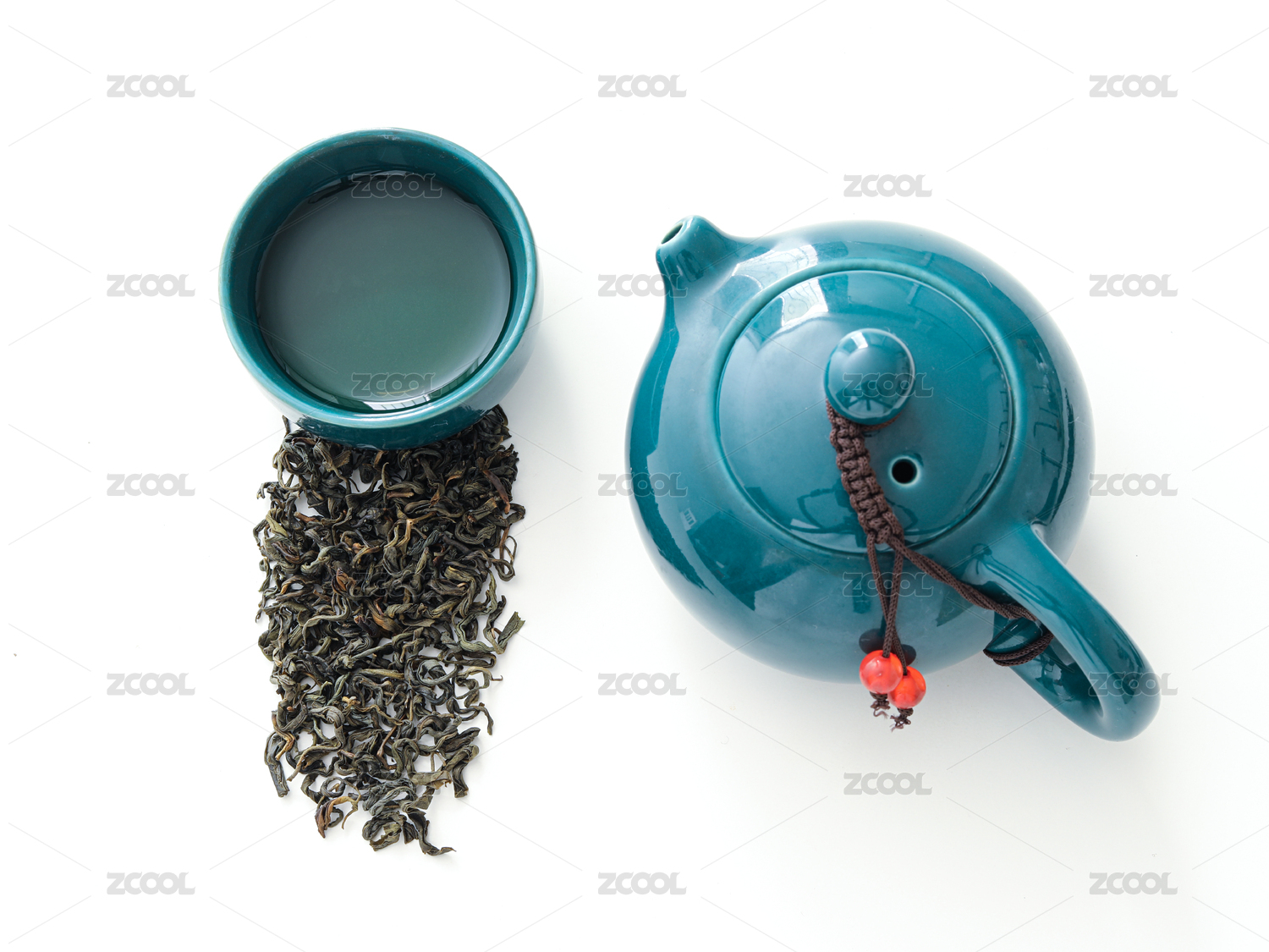 白色桌面上中国传统喝茶茶道的茶叶茶壶茶杯