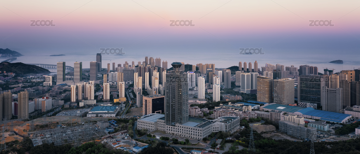 航拍青岛崂山区现代建筑景观和黄昏暮色