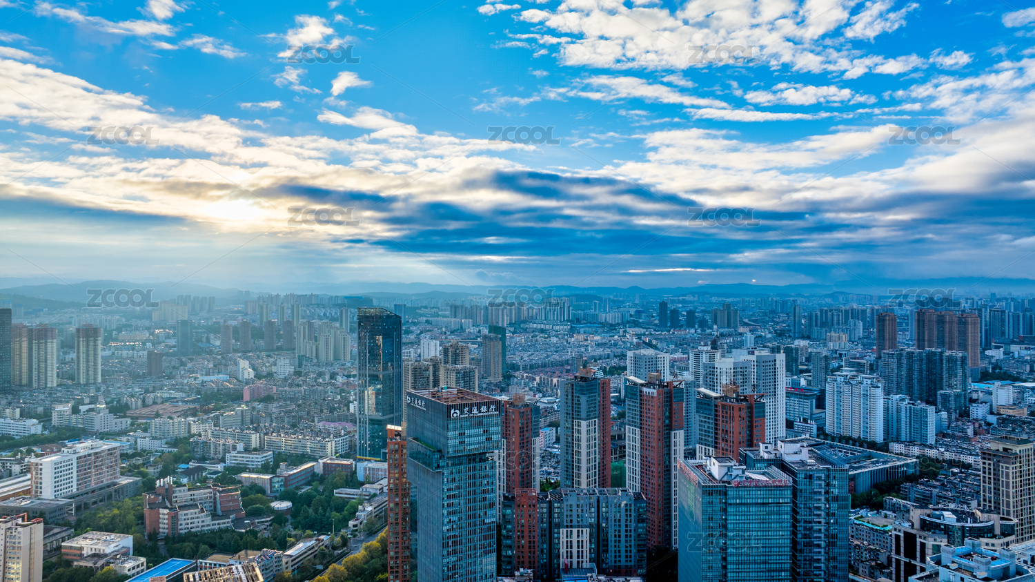 云南昆明主城区高楼清晨航拍