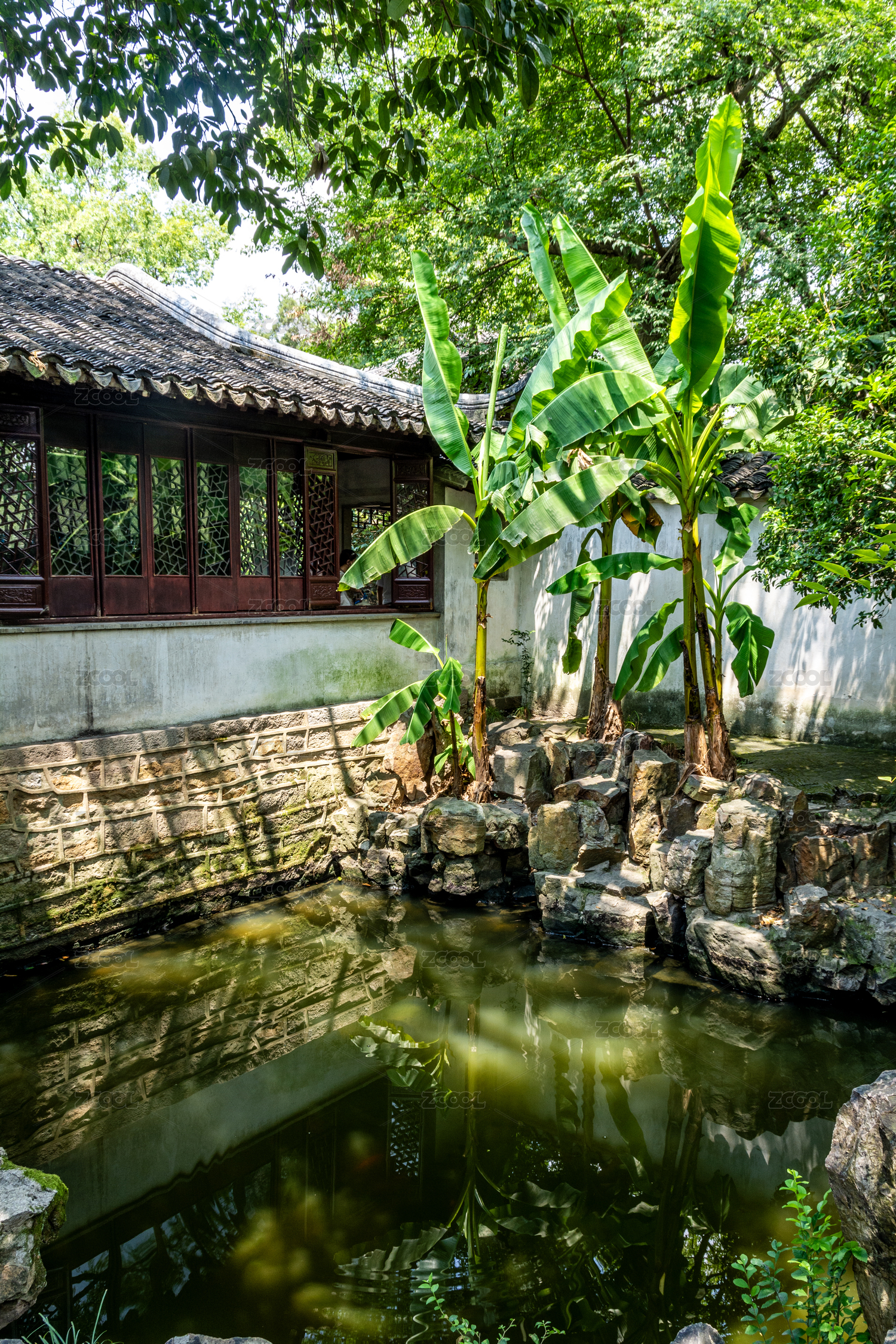 中国苏州园林清幽的自然风光,古建筑与绿树