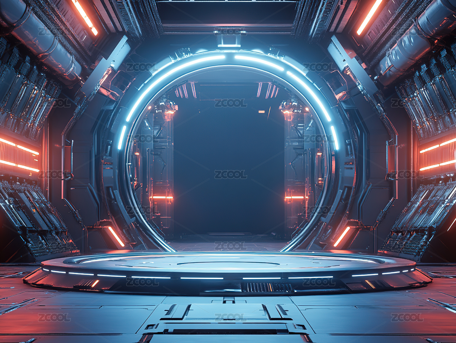 3D渲染科幻延伸空间站飞船走廊隧道背景