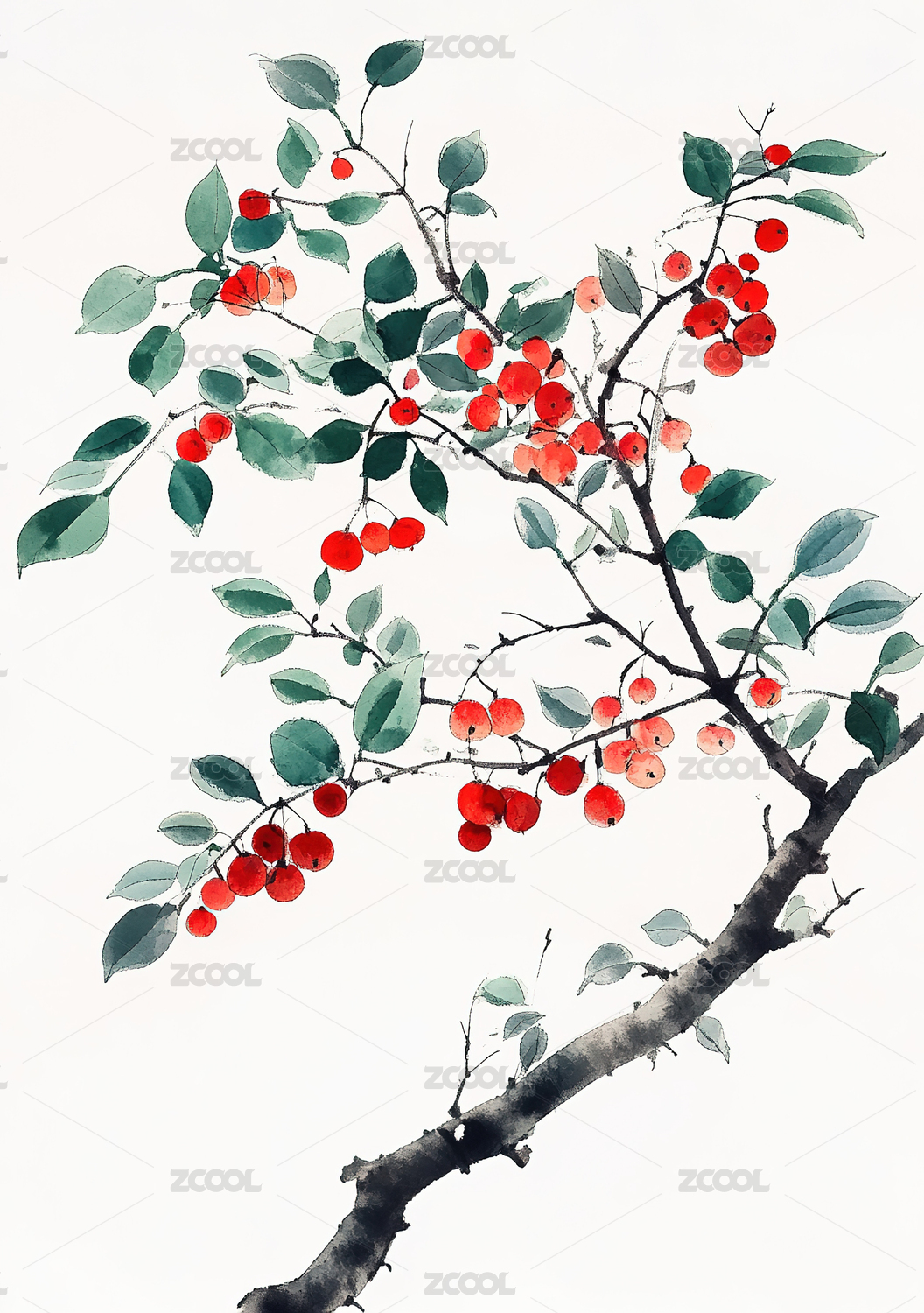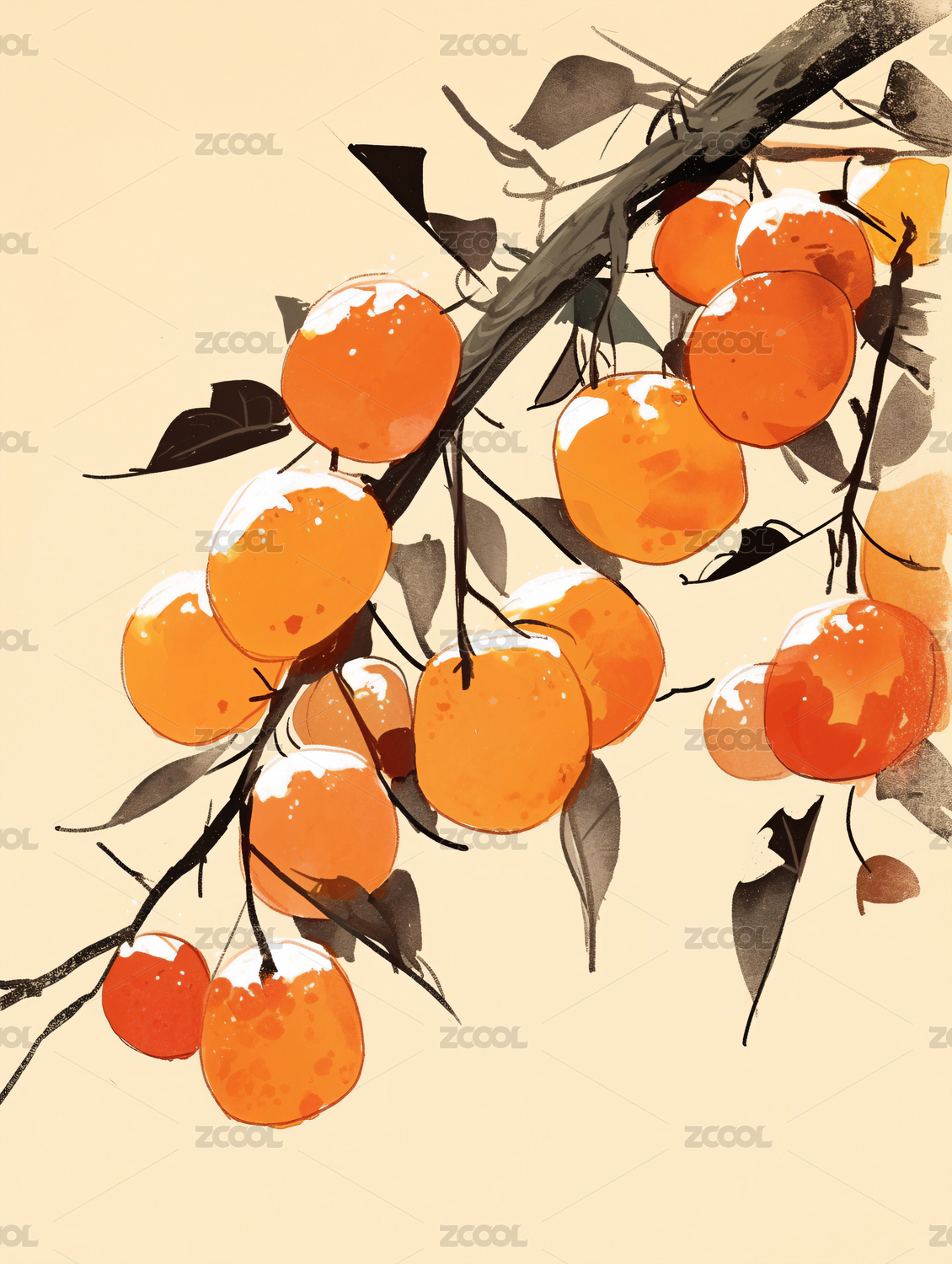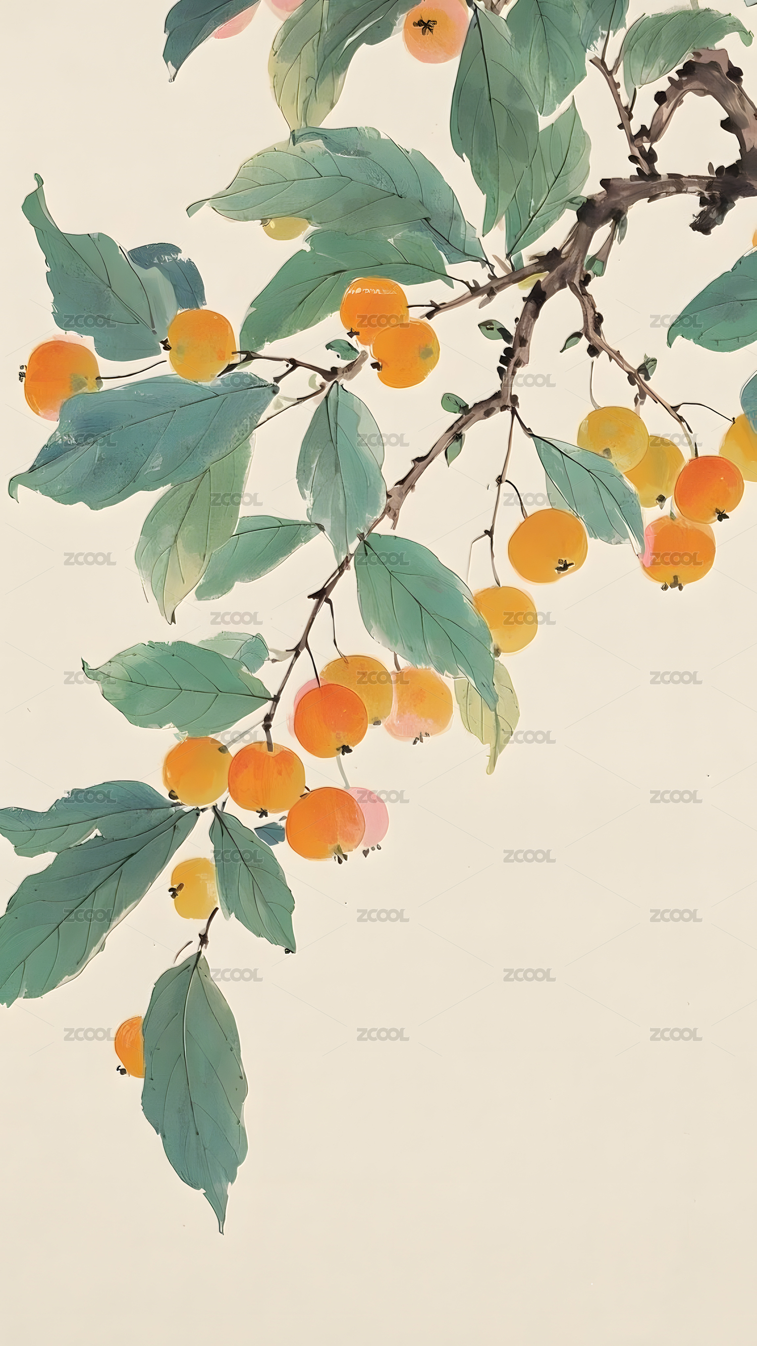 AIGC202402,秋天,水墨画,插画,食物,水果,树叶,叶子,树,草