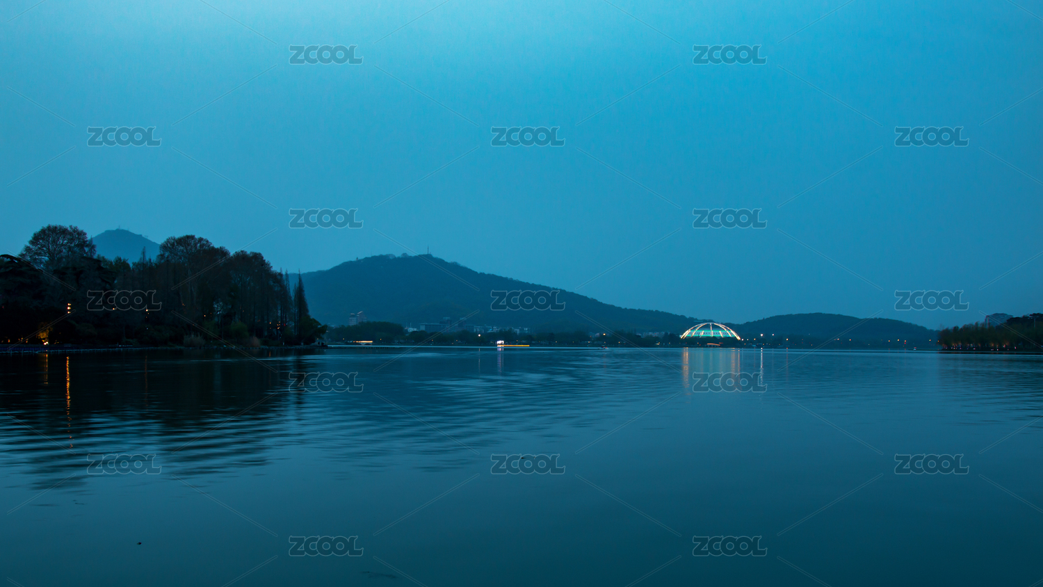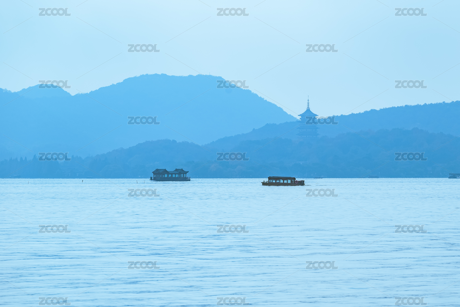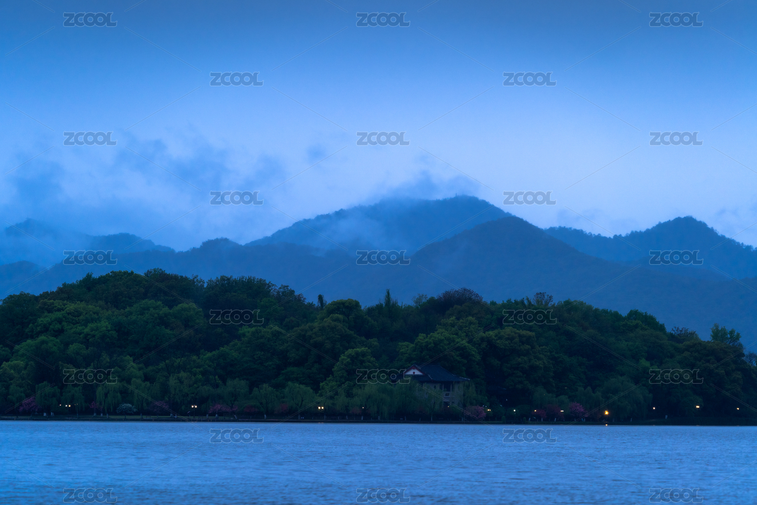 江南杭州西湖春天雷雨后傍晚蓝调自然风景
