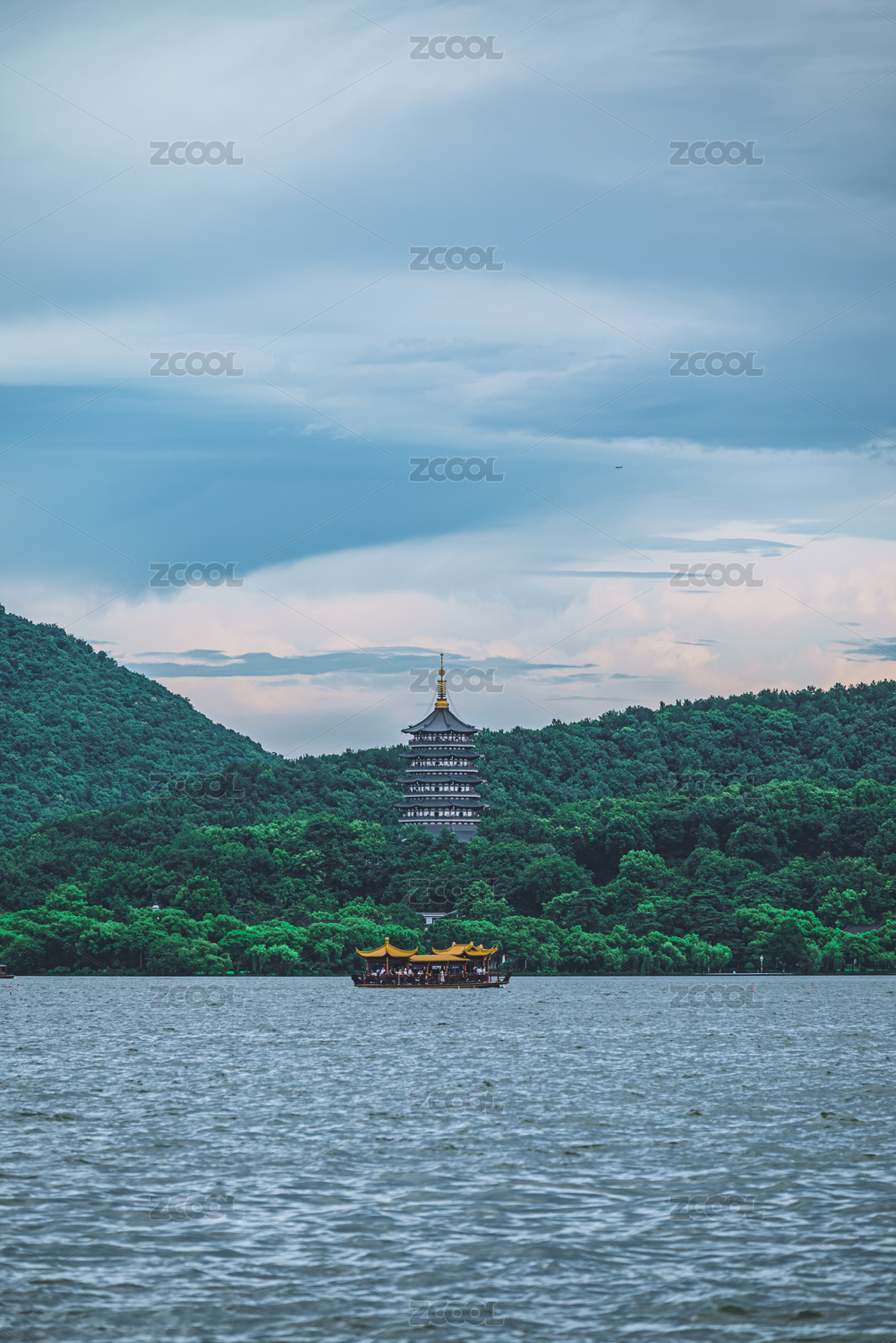 江南杭州西湖雷峰塔春天雷雨后傍晚蓝调风景