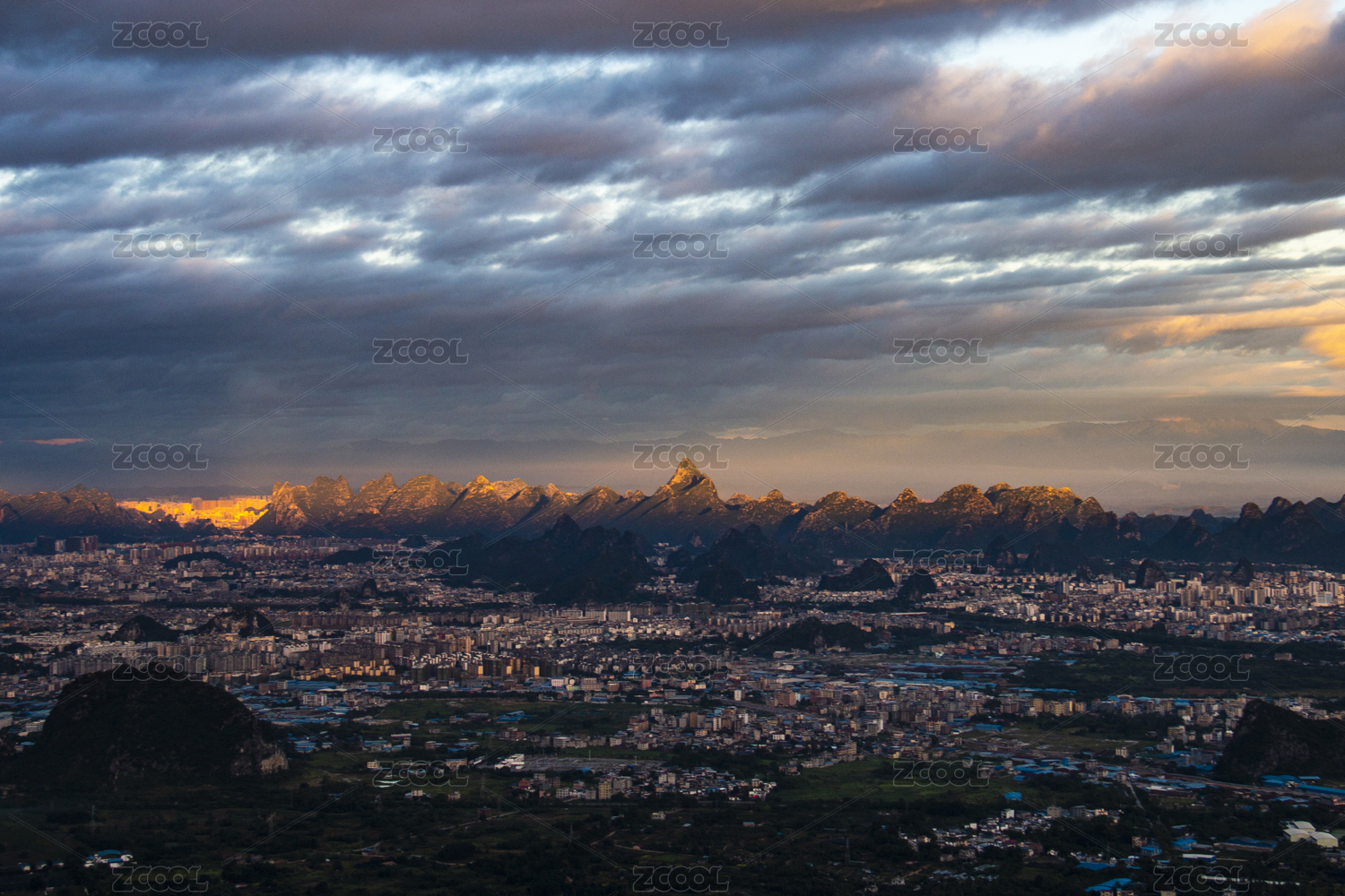 晚霞中俯拍群山环抱的桂林城区