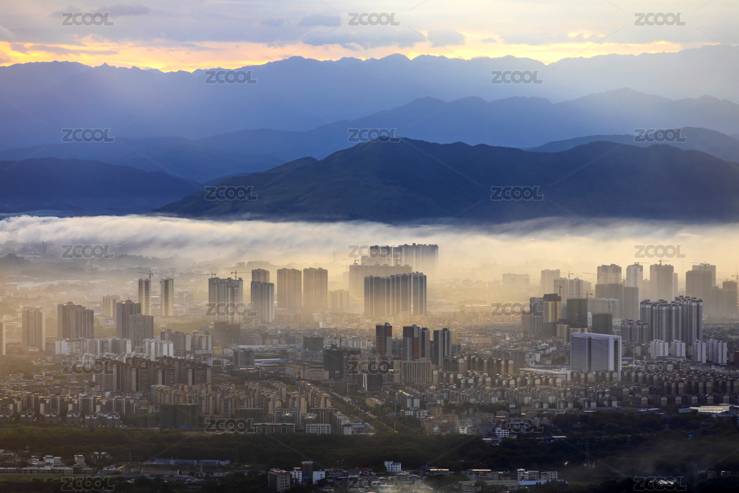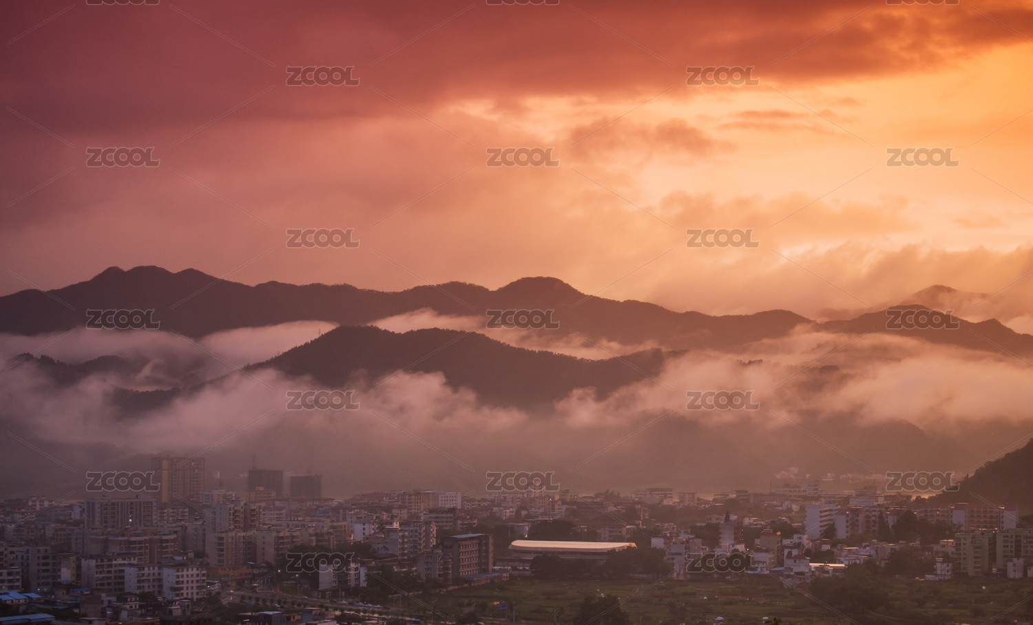 云海下的广东中山城区与五桂山山脉城市风光