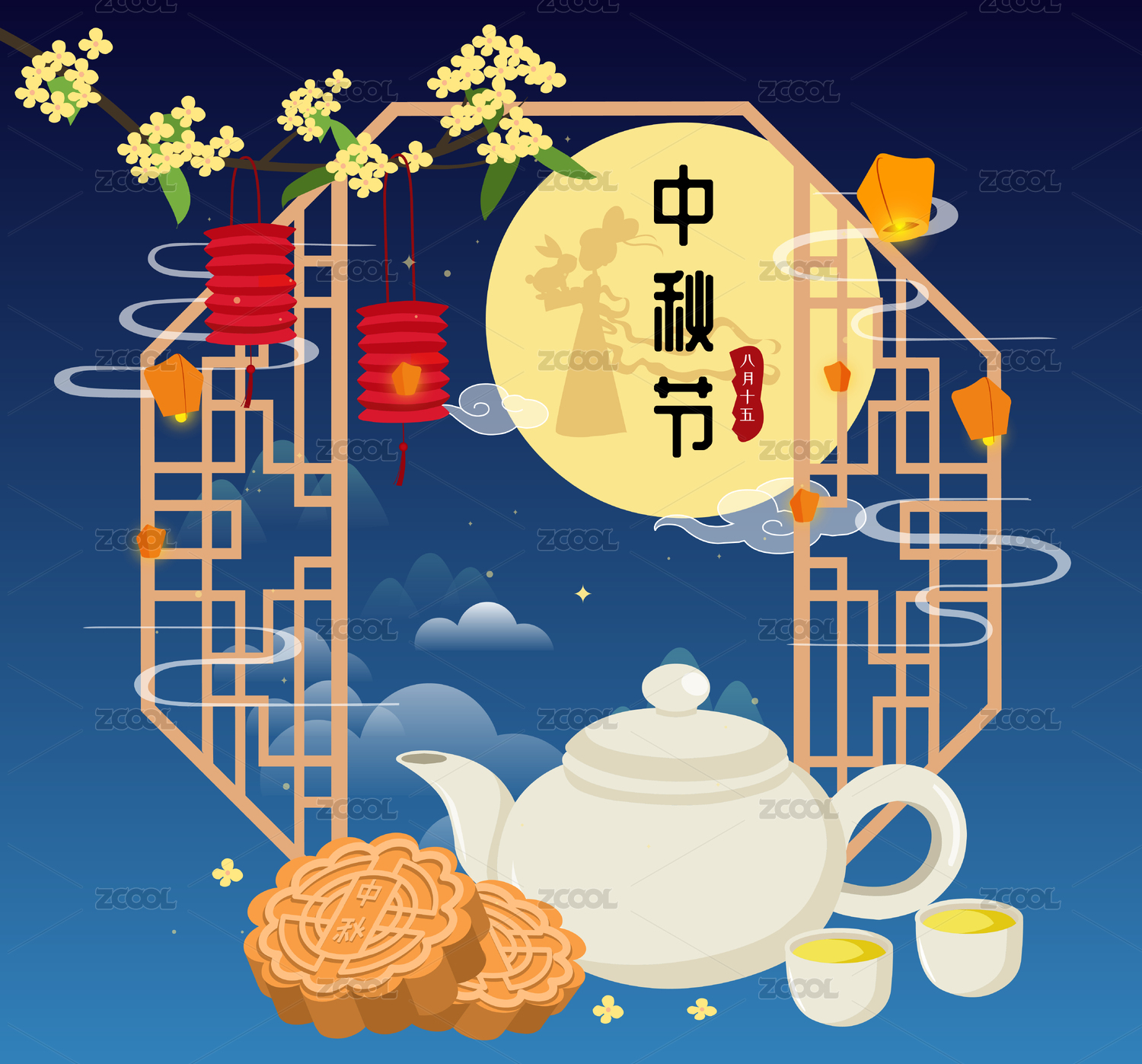 中国传统节日中秋节月亮下桌上的月饼和茶壶