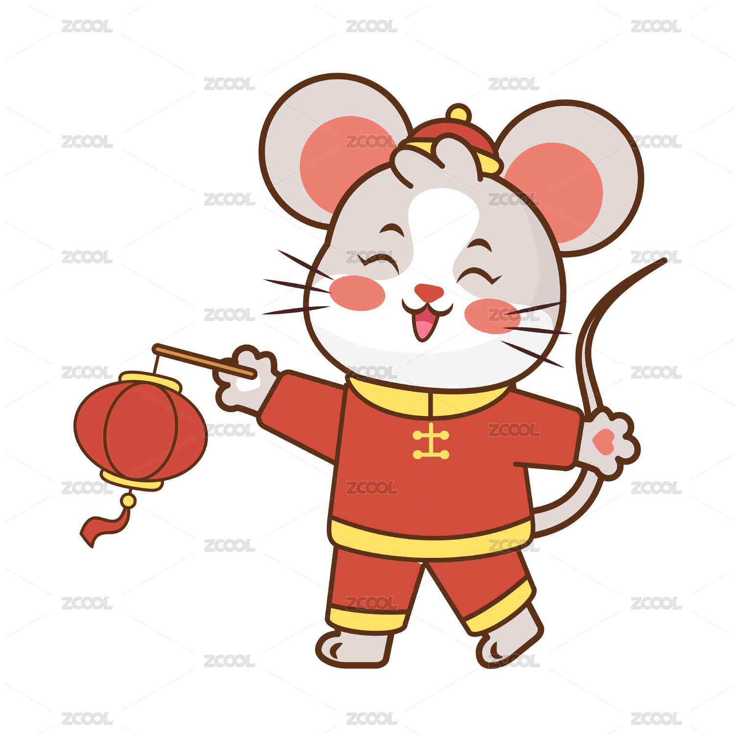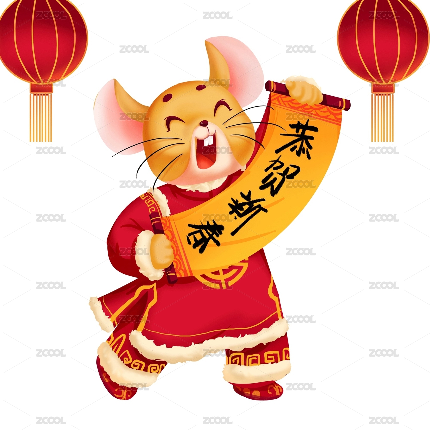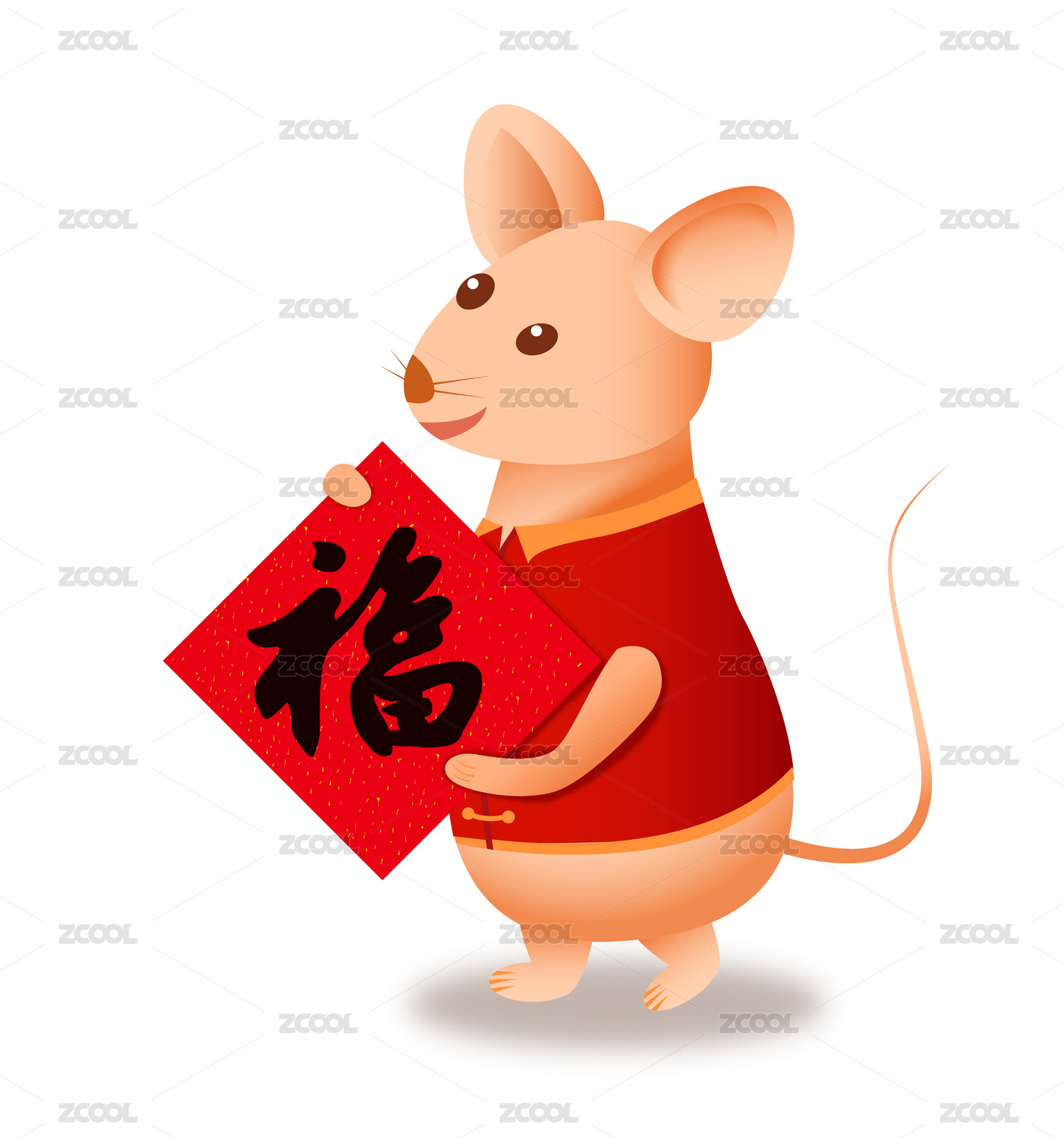 穿红衣服手拿福字的老鼠,新年插画