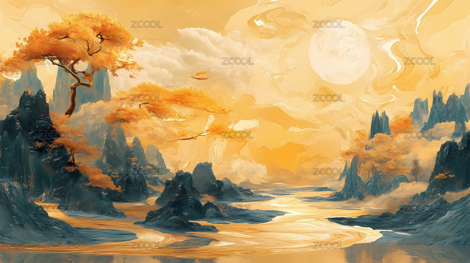 金色树叶山峦水墨画抽象艺术