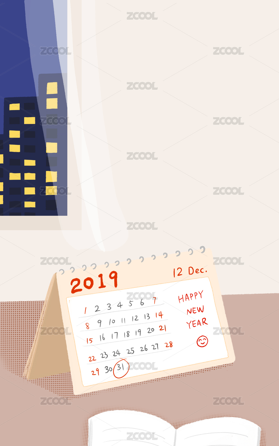 室内放在桌子上的台历在元旦前一天上画了个圈 手绘插画