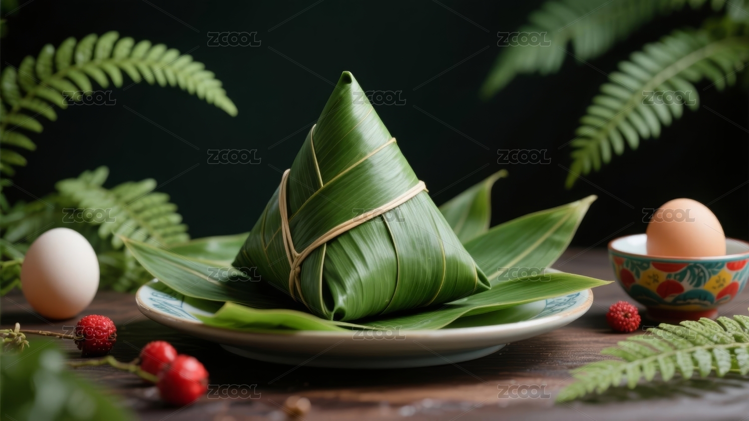 五个立着放着复古盘里的尖角粽子,旁边摆放着粽子食材