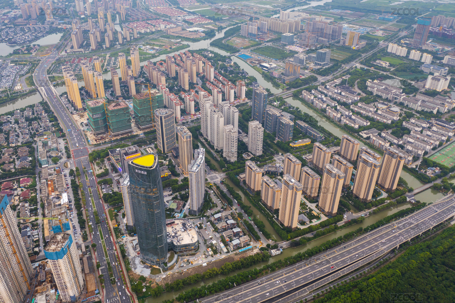 江西南昌鸟瞰城市高速公路与高楼交汇航拍