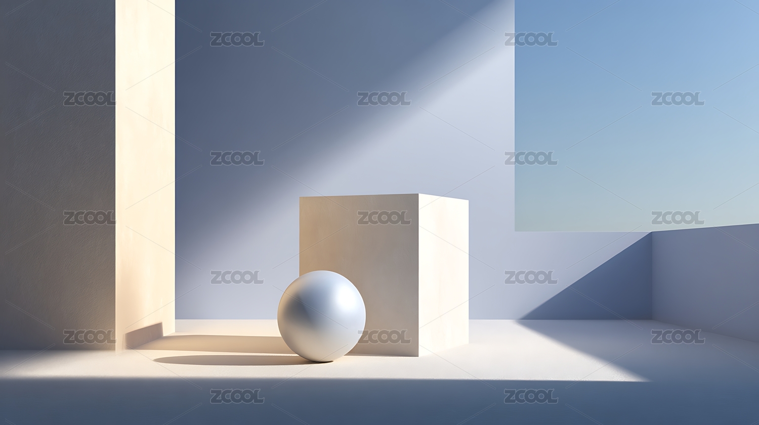 3D渲染,简约风格,现代设计,光线,阴影,立方体,科技感,未来感,球体,蓝色背景