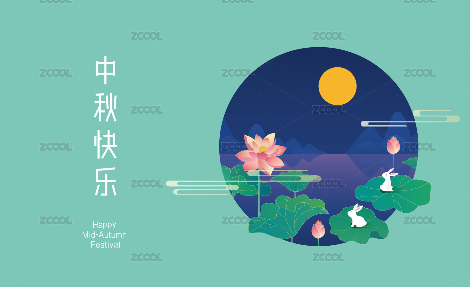 中秋圆月里山水荷花下兔子观月