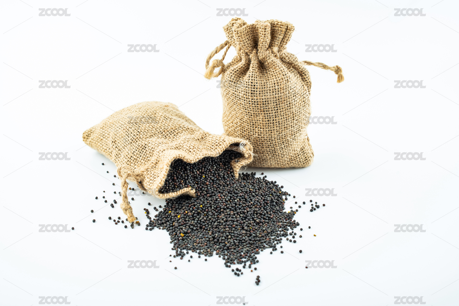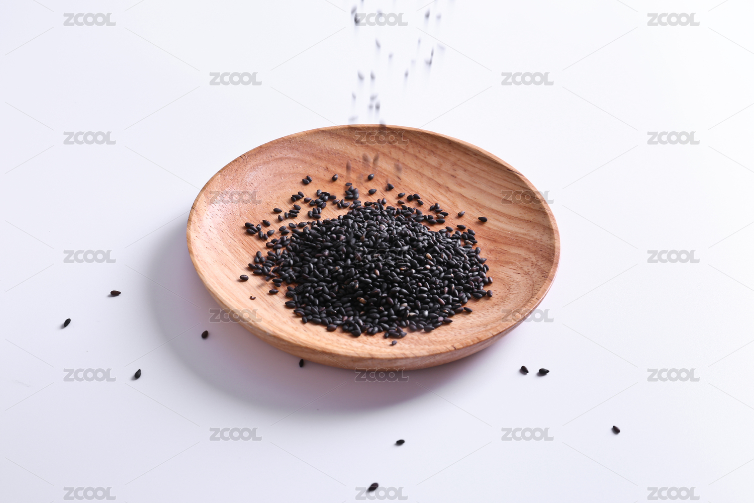 白底上俯拍布袋子倒出来和勺子装着的黑芝麻