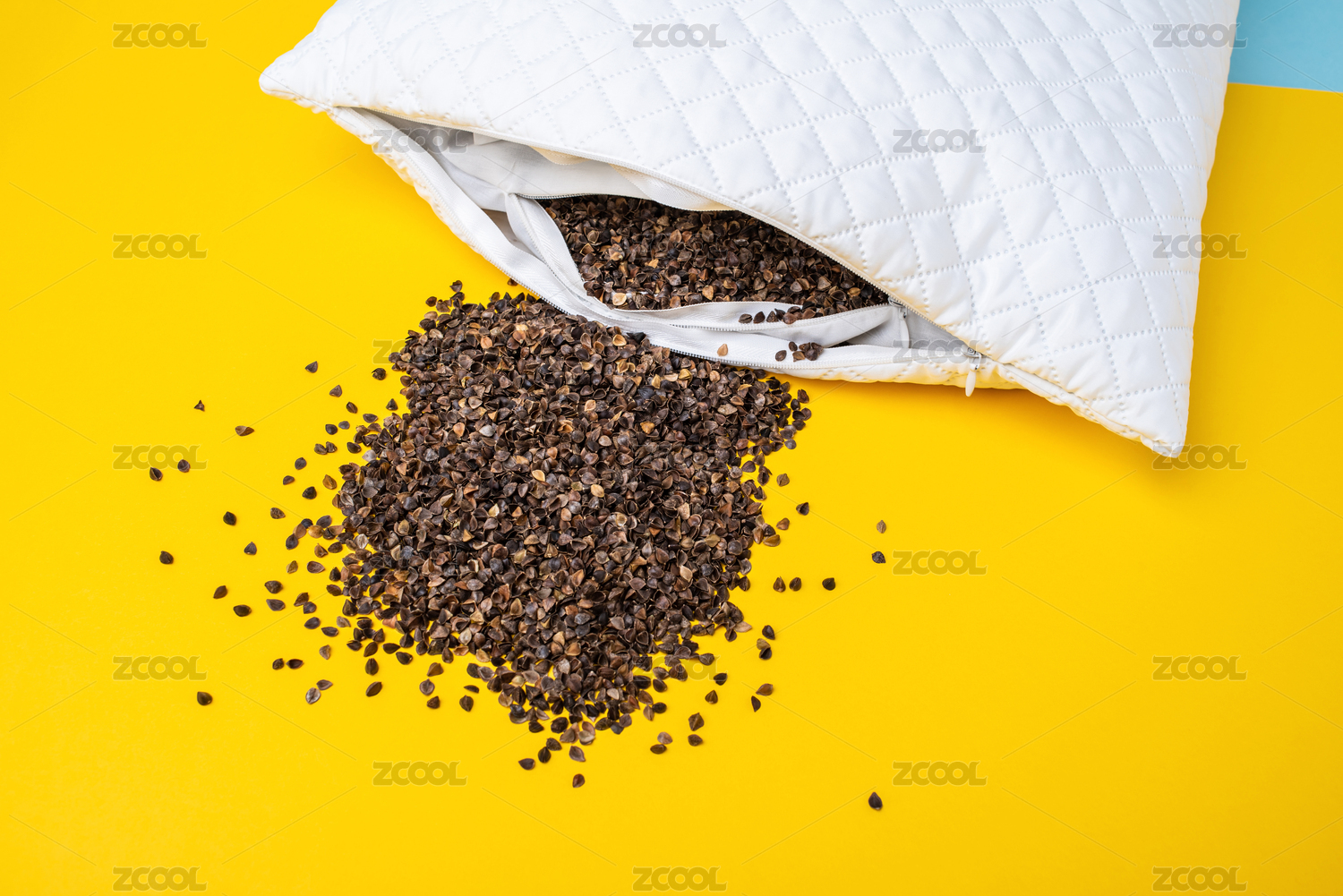 白色枕头枕芯洒出来的填充植物荞麦壳