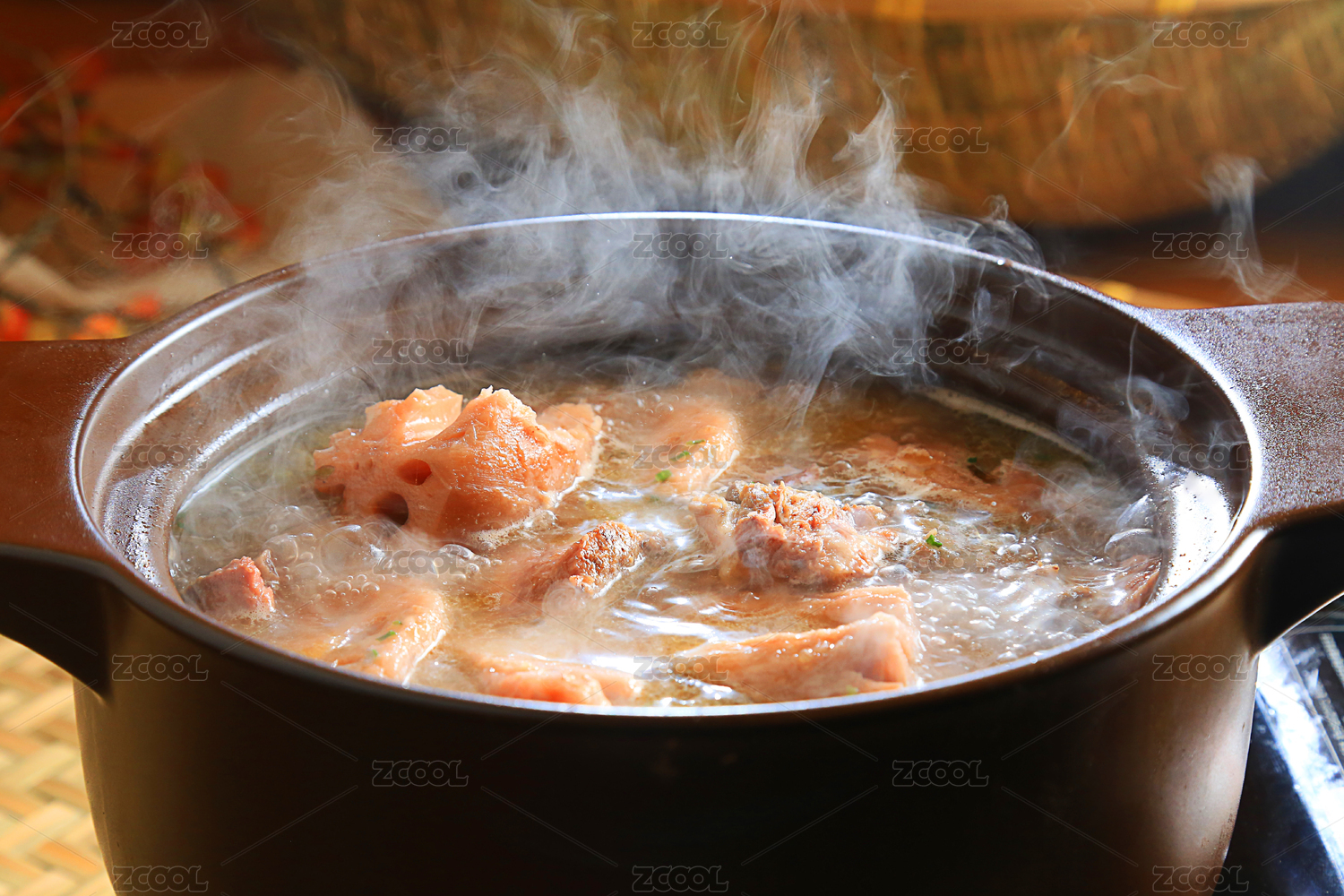 竹簸箕上的炖锅里的冒着热气的一锅排骨藕汤