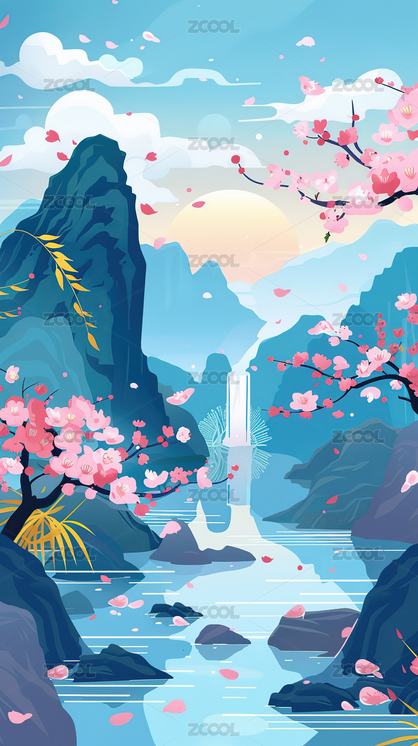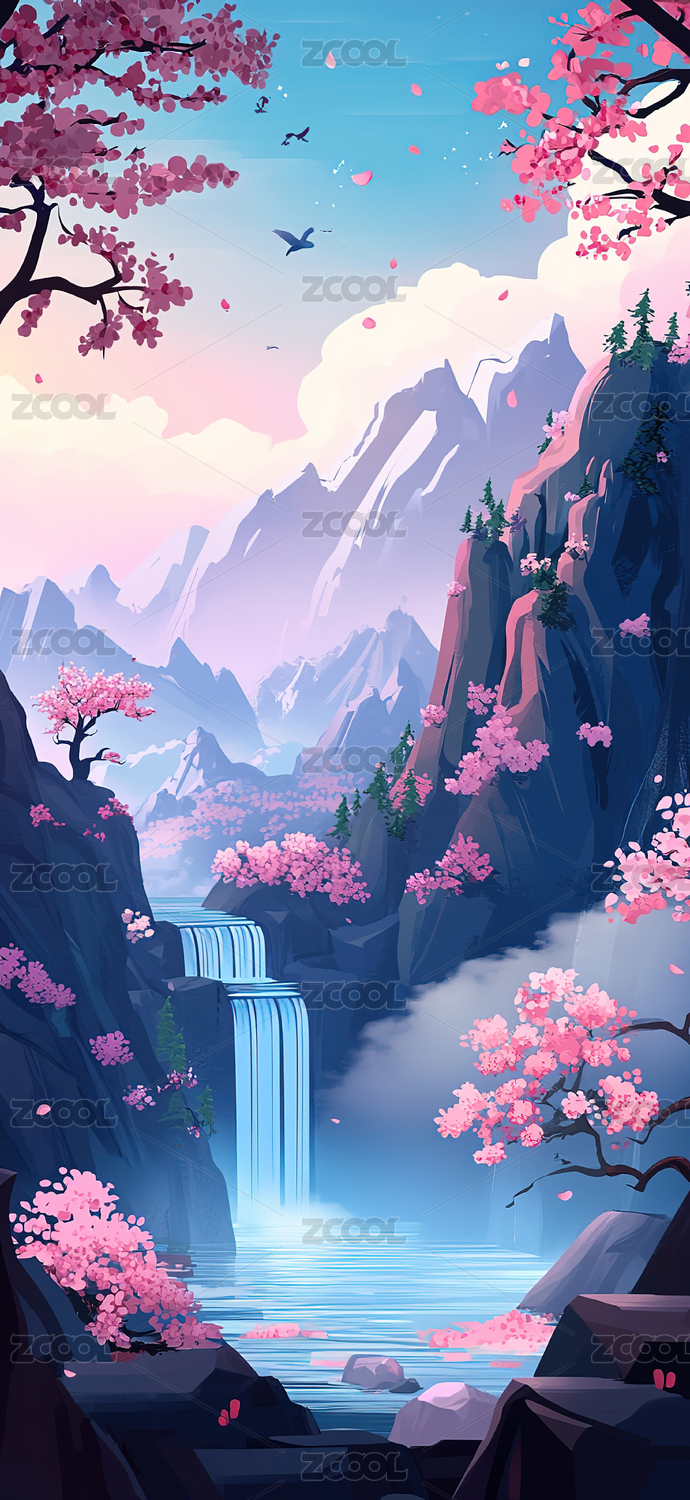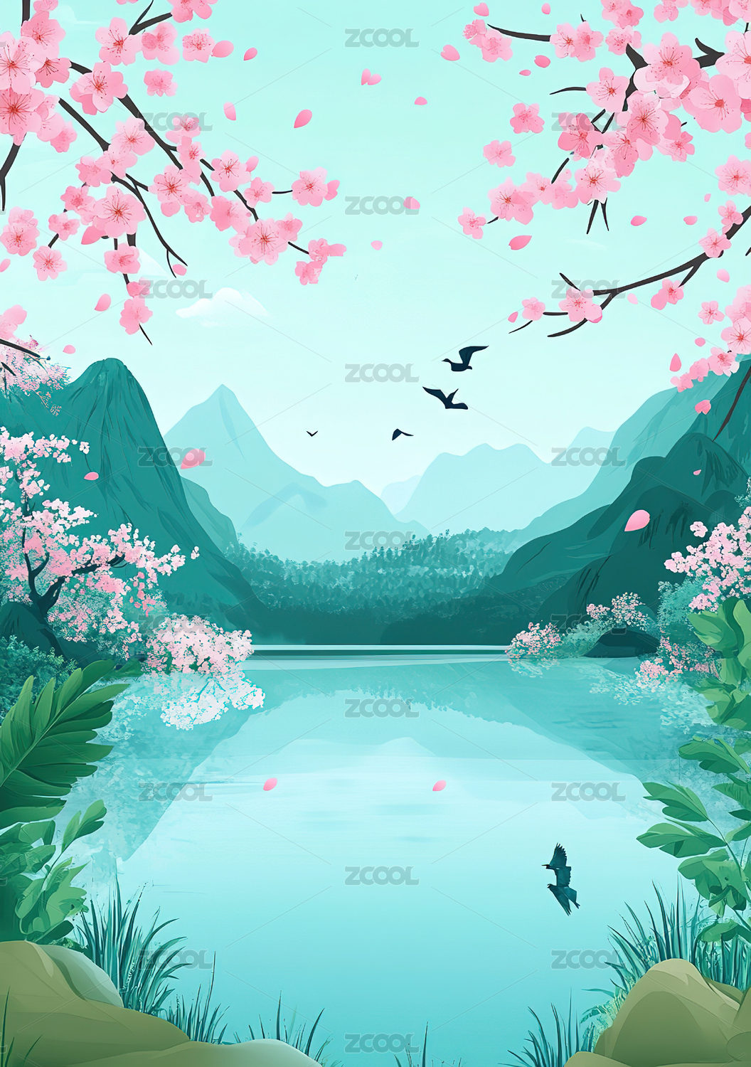 樱花,树木,飞翔,鸟儿,山峦,水面,湖泊,花瓣,落叶,自然