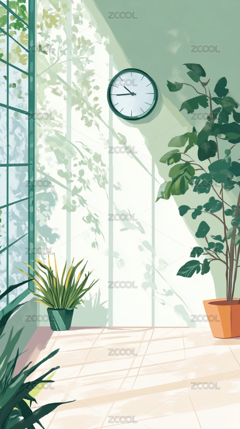 有绿植的室内墙面的圆型挂钟清新插画绘画