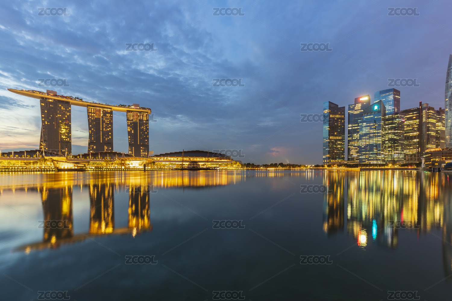 傍晚的新加坡滨海湾金沙酒店和摩天轮