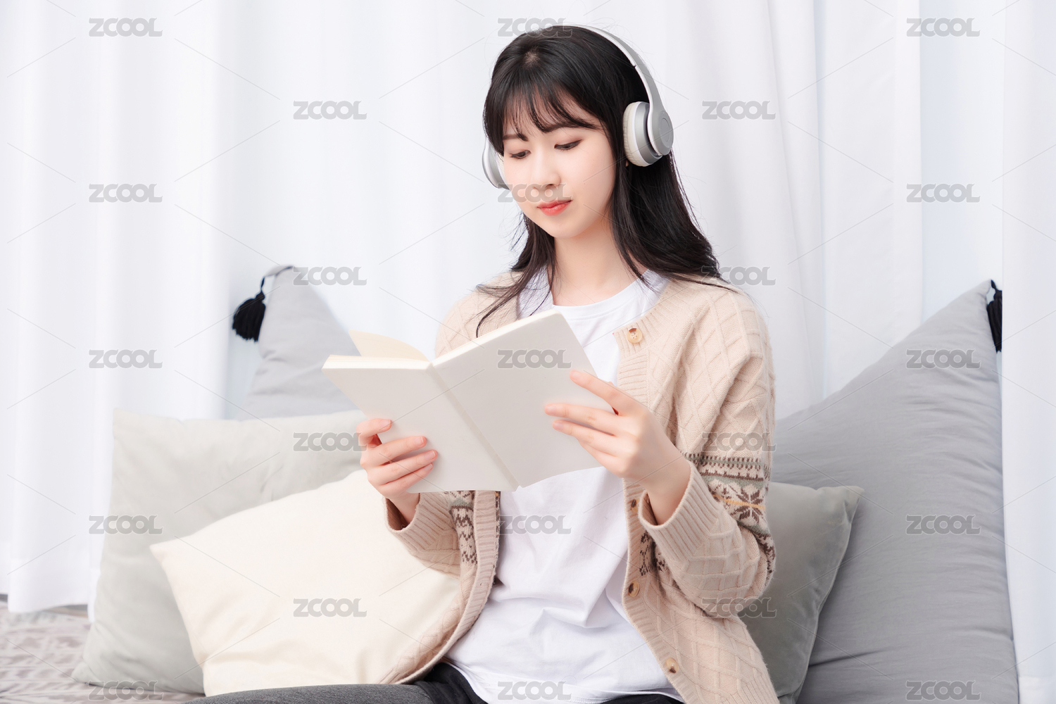 在沙发上听音乐看书