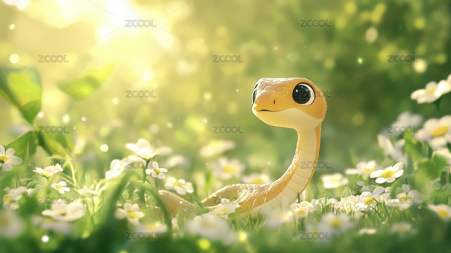 一条可爱的卡通小蛇在白色花和绿草丛中