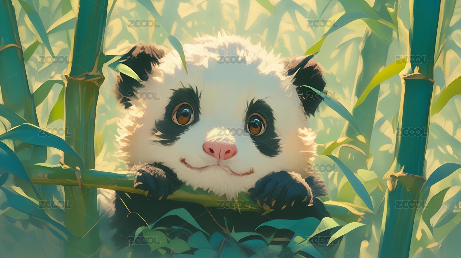 熊猫依偎竹子林间光影斑驳