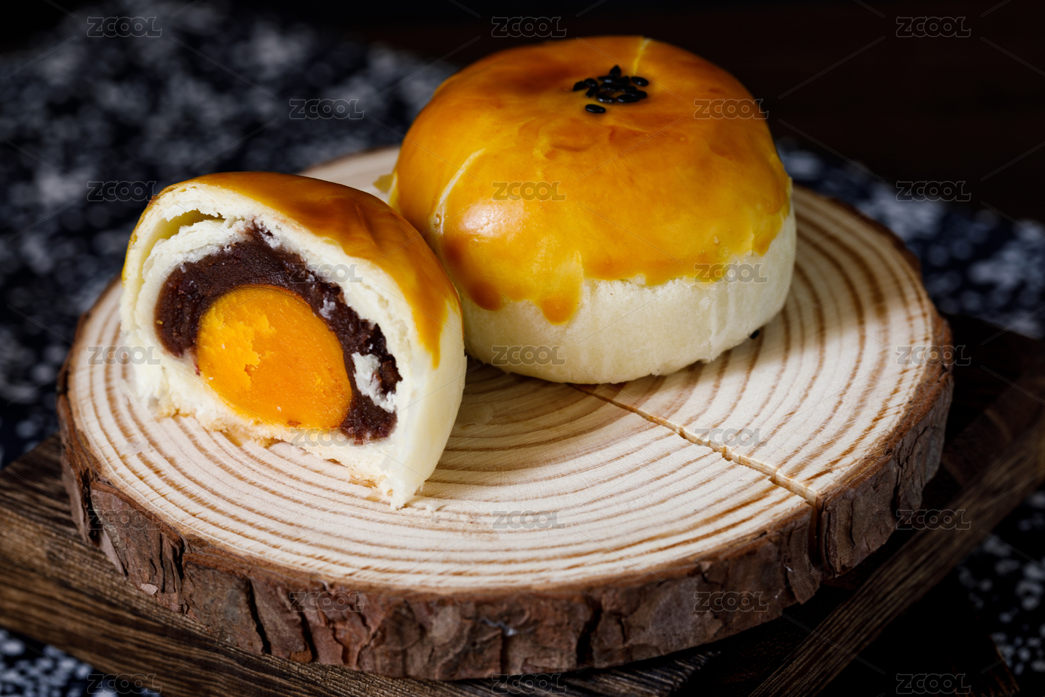 放在木片上的中国中秋节特色点心—蛋黄酥皮月饼