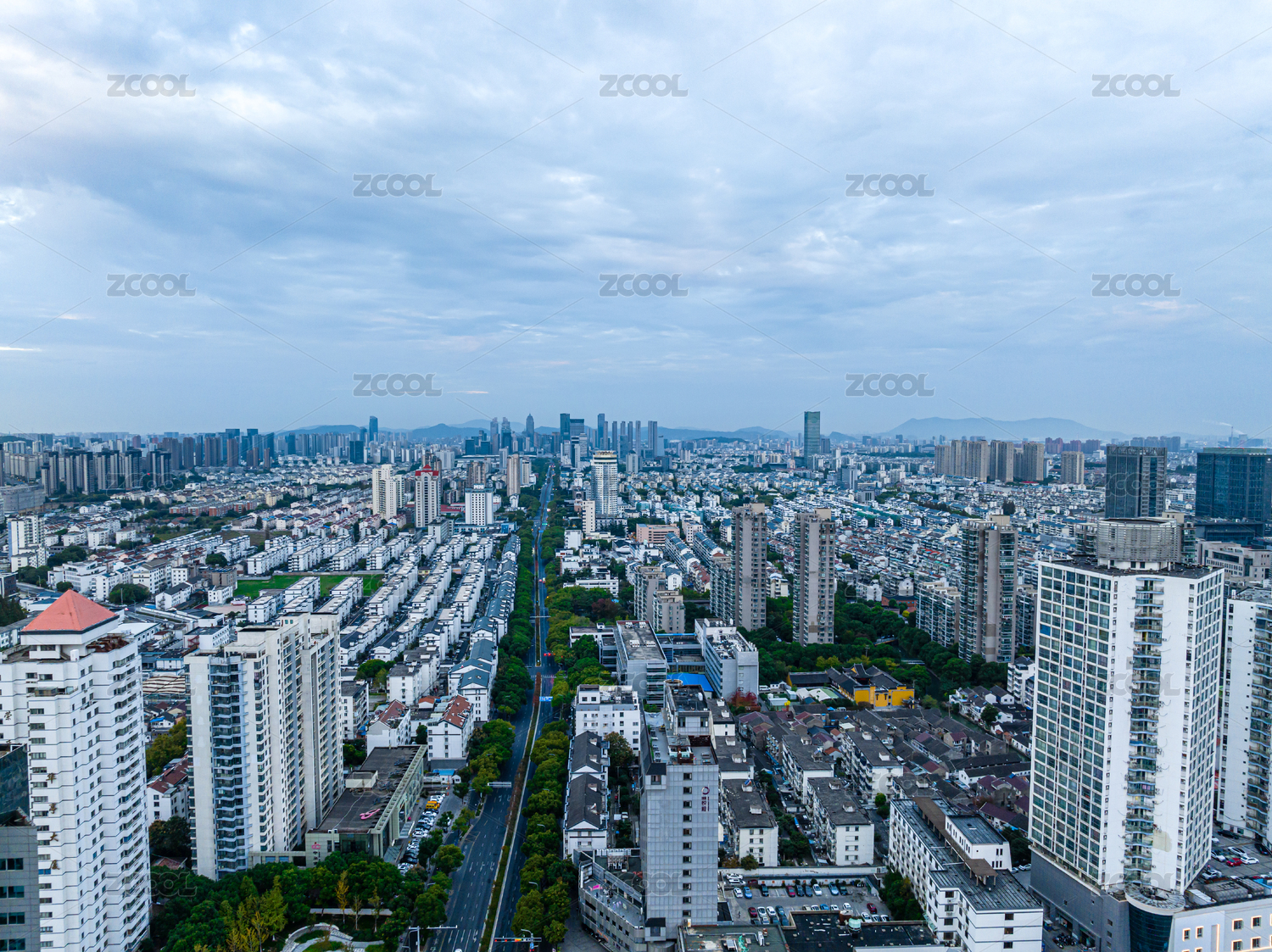 中国无锡,傍晚的城市天际线和交通道路