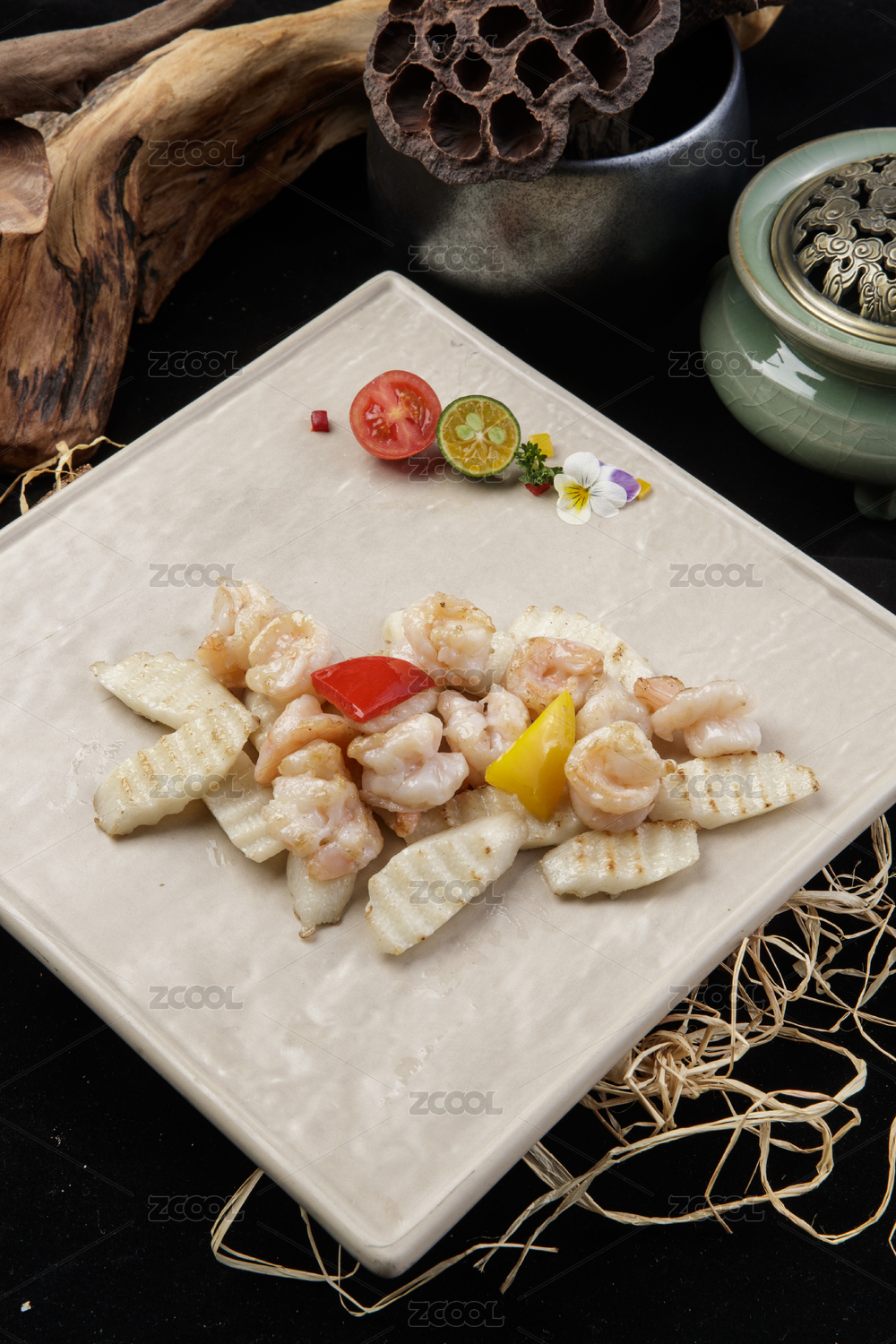 米黄色瓷盘装的虾仁长山药包放在黑色背景上