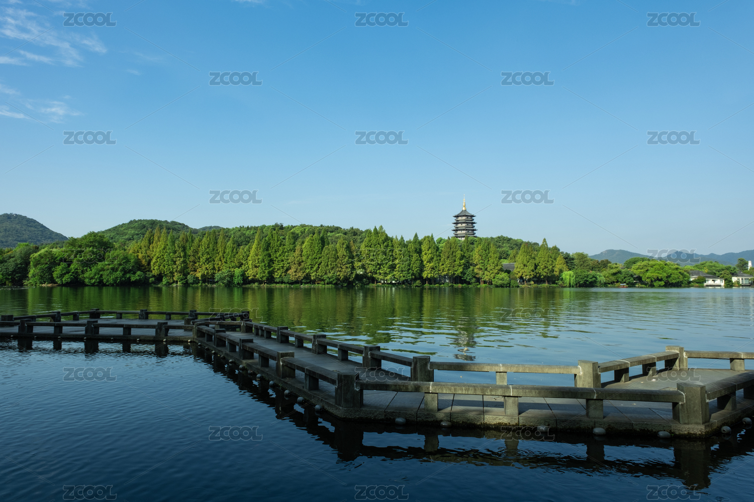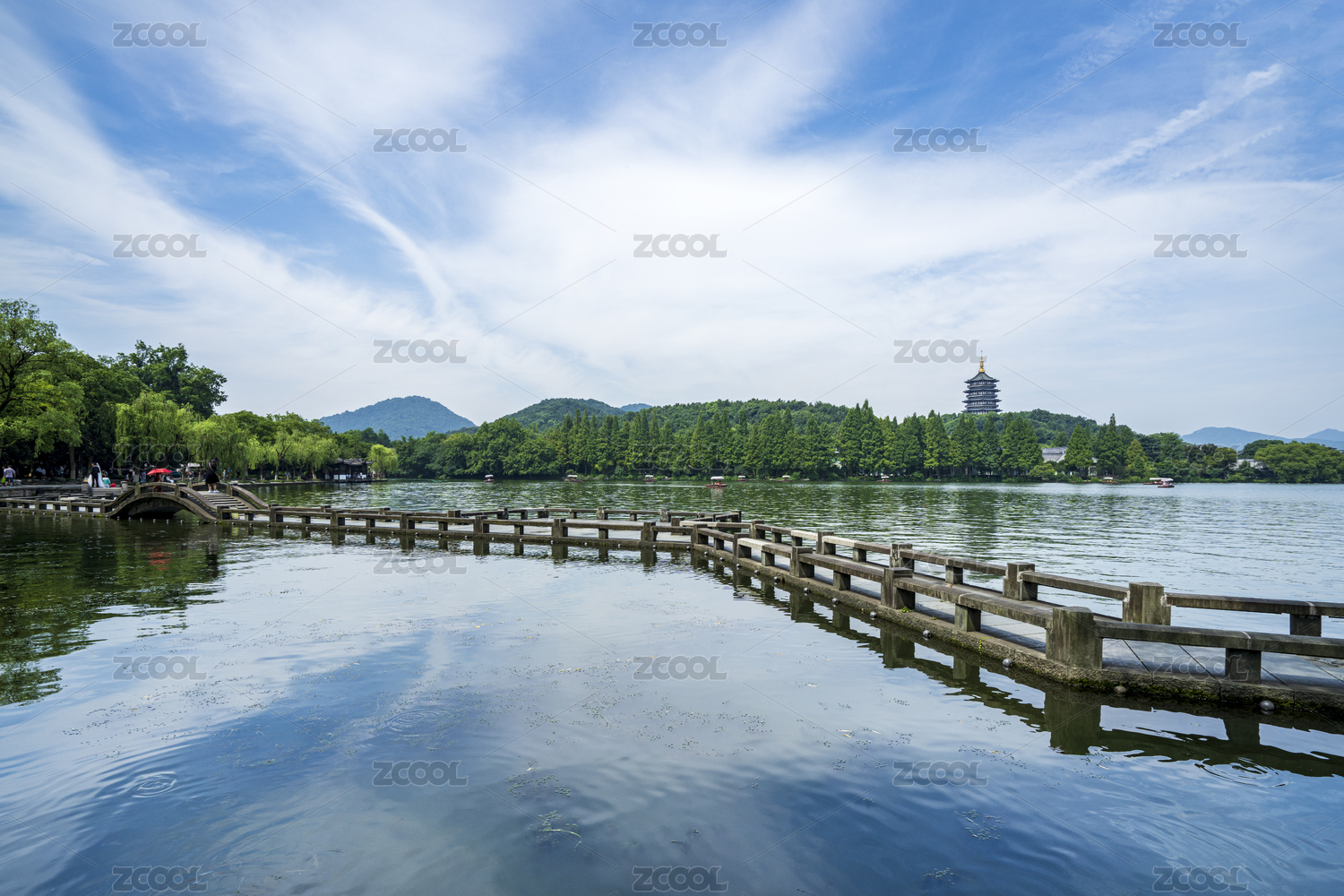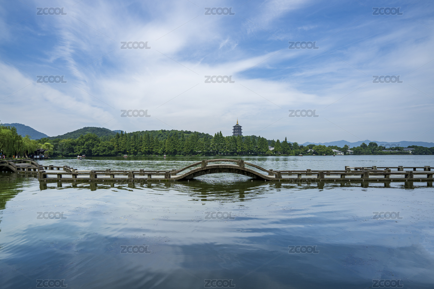 中国浙江杭州西湖地标景点雷峰塔与长桥风光
