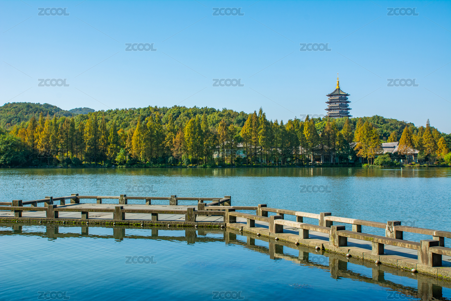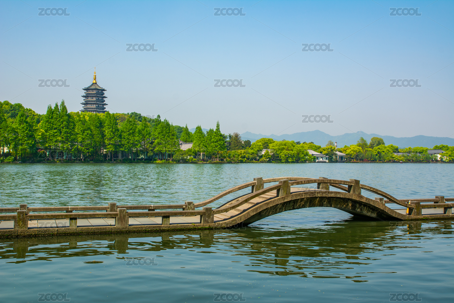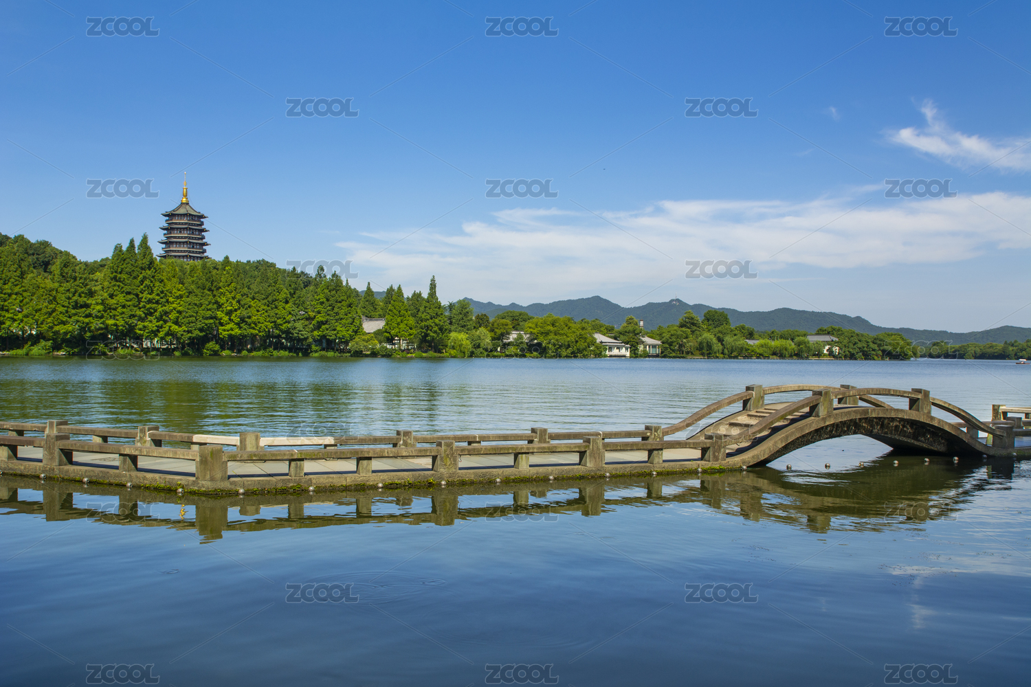 中国浙江杭州西湖地标建筑雷峰塔与长桥