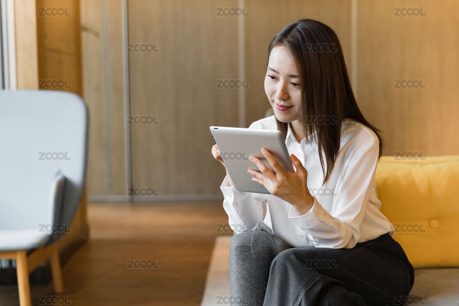 一名年轻女性商务人士坐在沙发上使用平板电脑