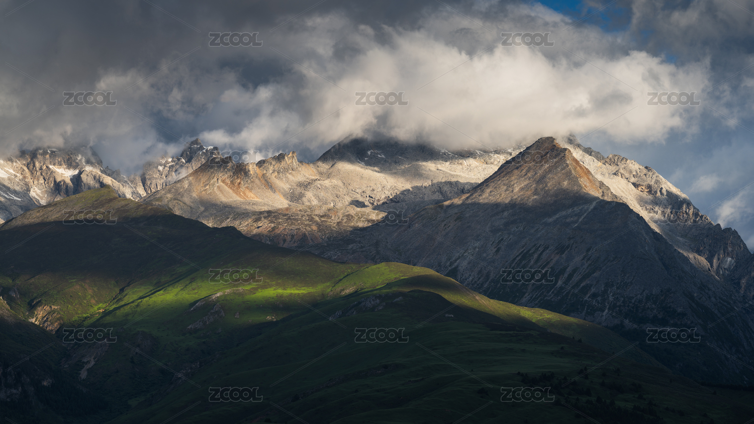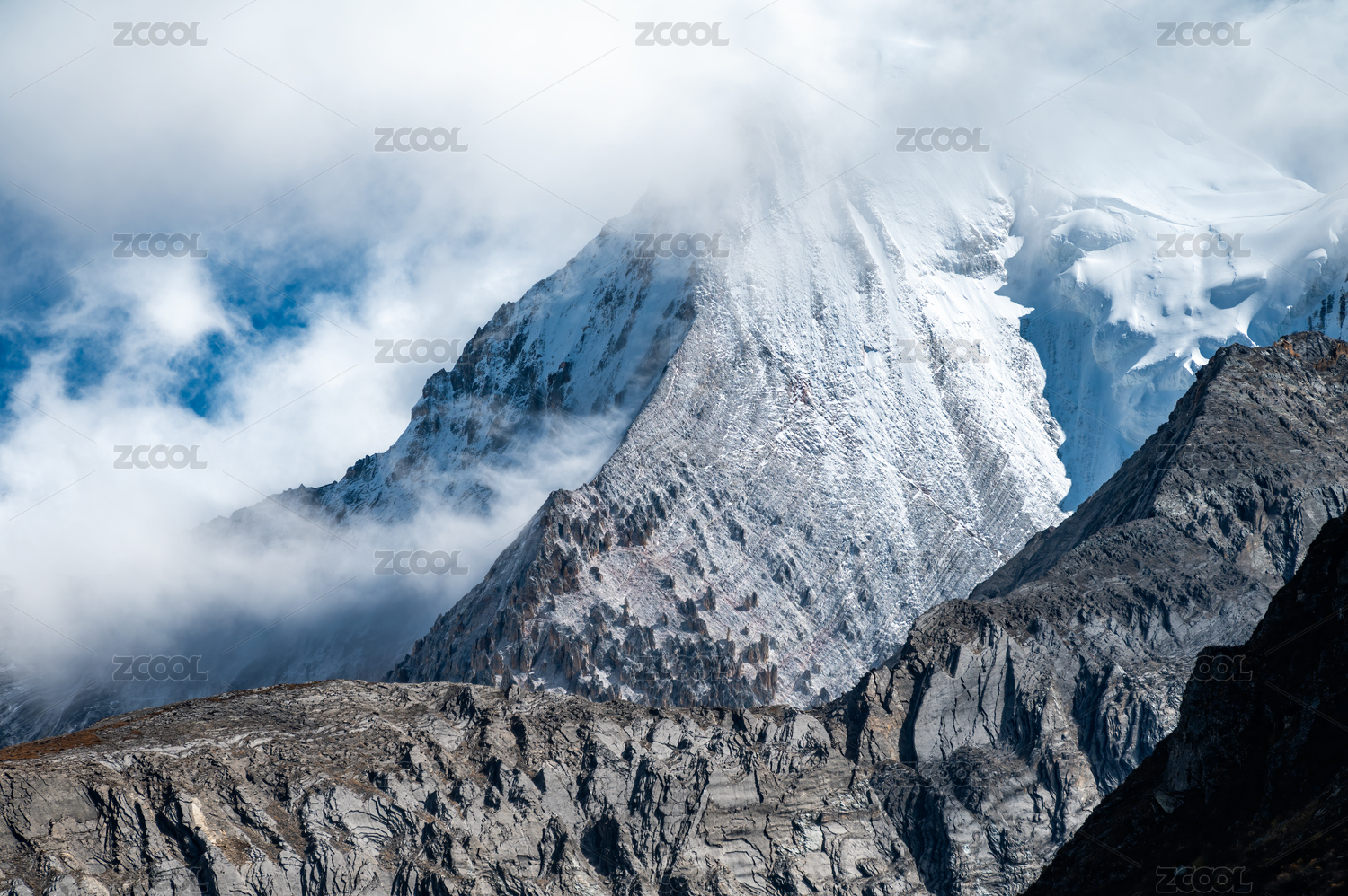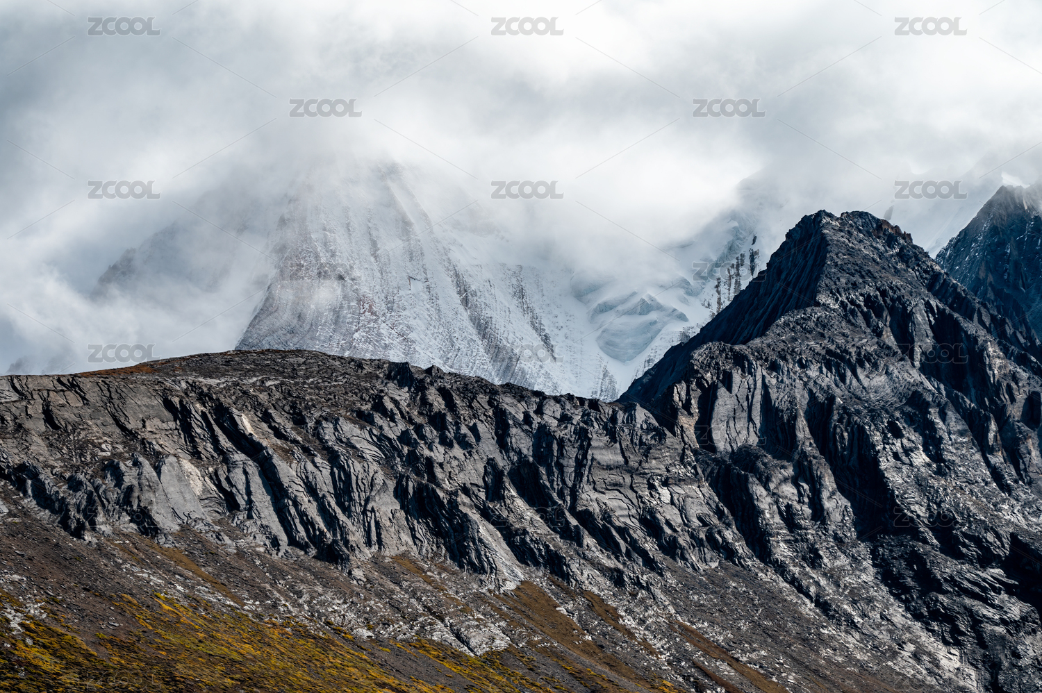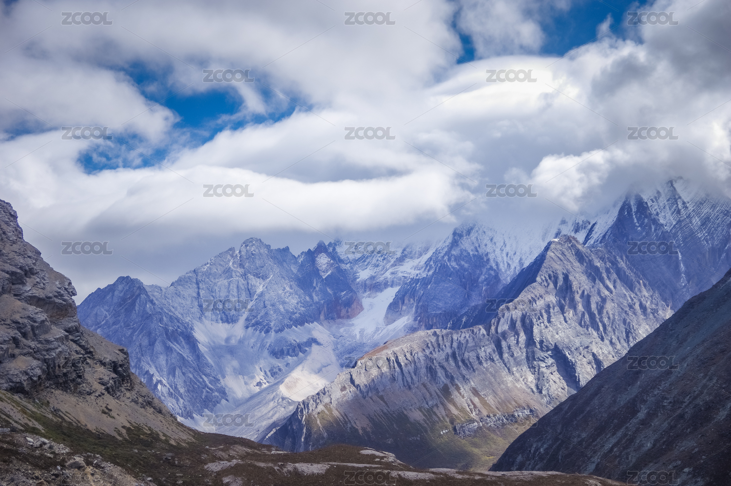 四川稻城亚丁云雾缭绕的高原雪山