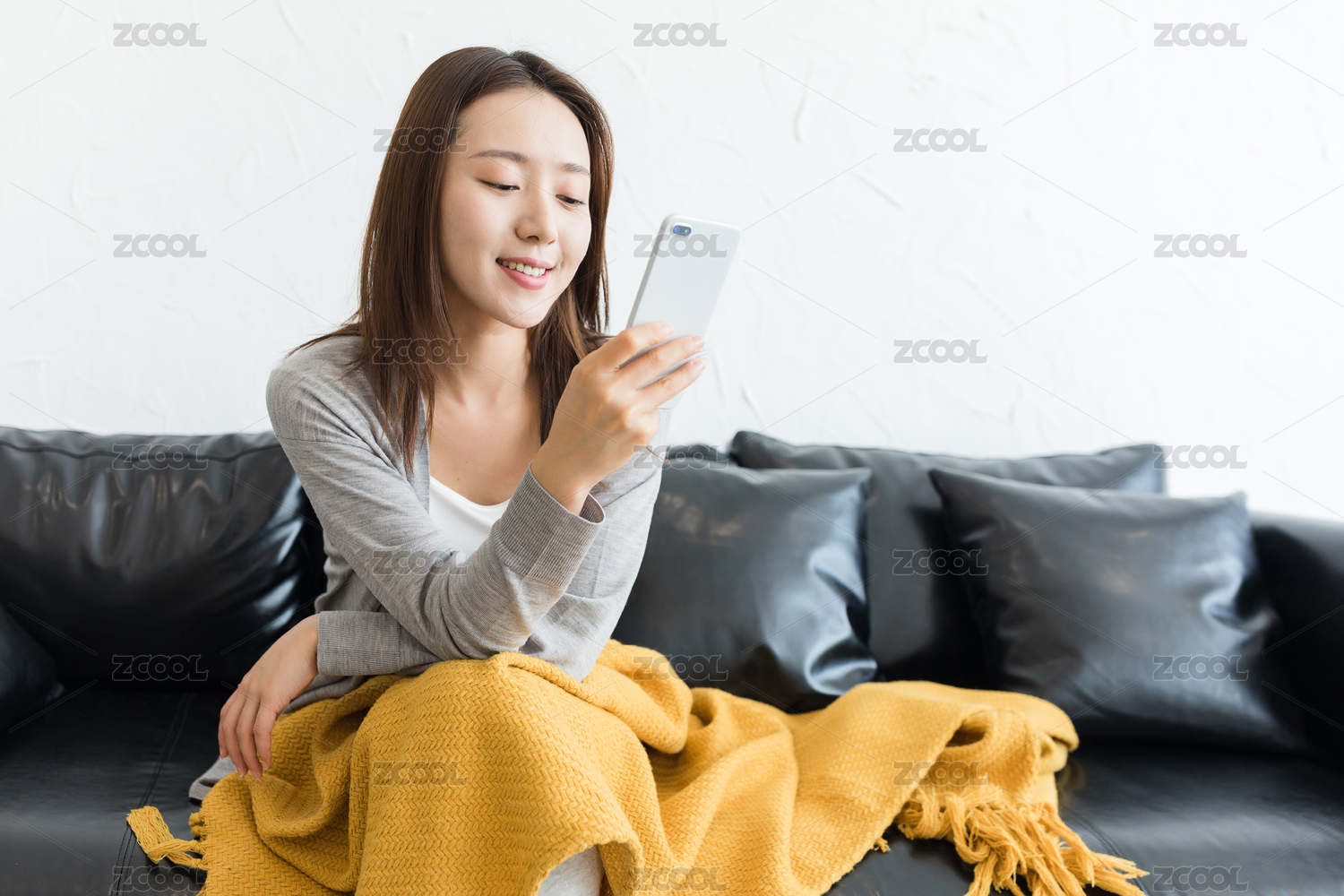 年轻女性在家坐在沙发上玩手机放松