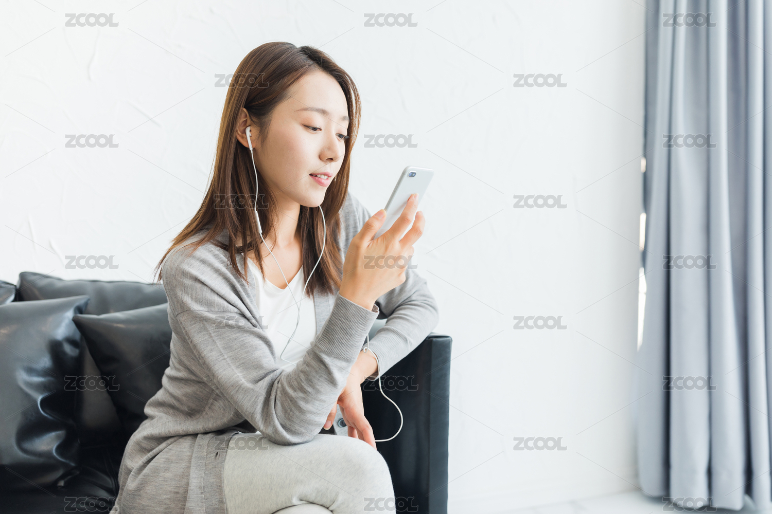 年轻女性在家烤着沙发使用手机听音乐看着窗外