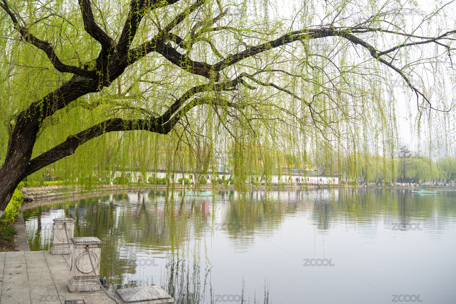 春天公园湖畔的垂柳