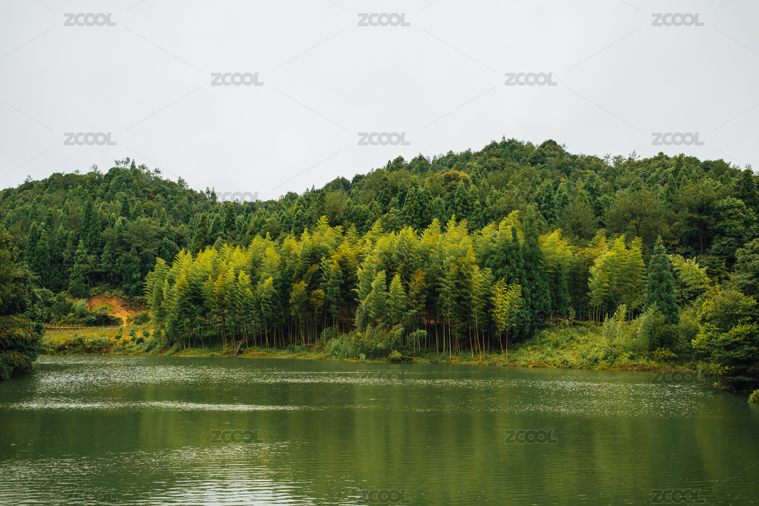 福建漳州华安贡鸭山中的湖畔竹林与山峦