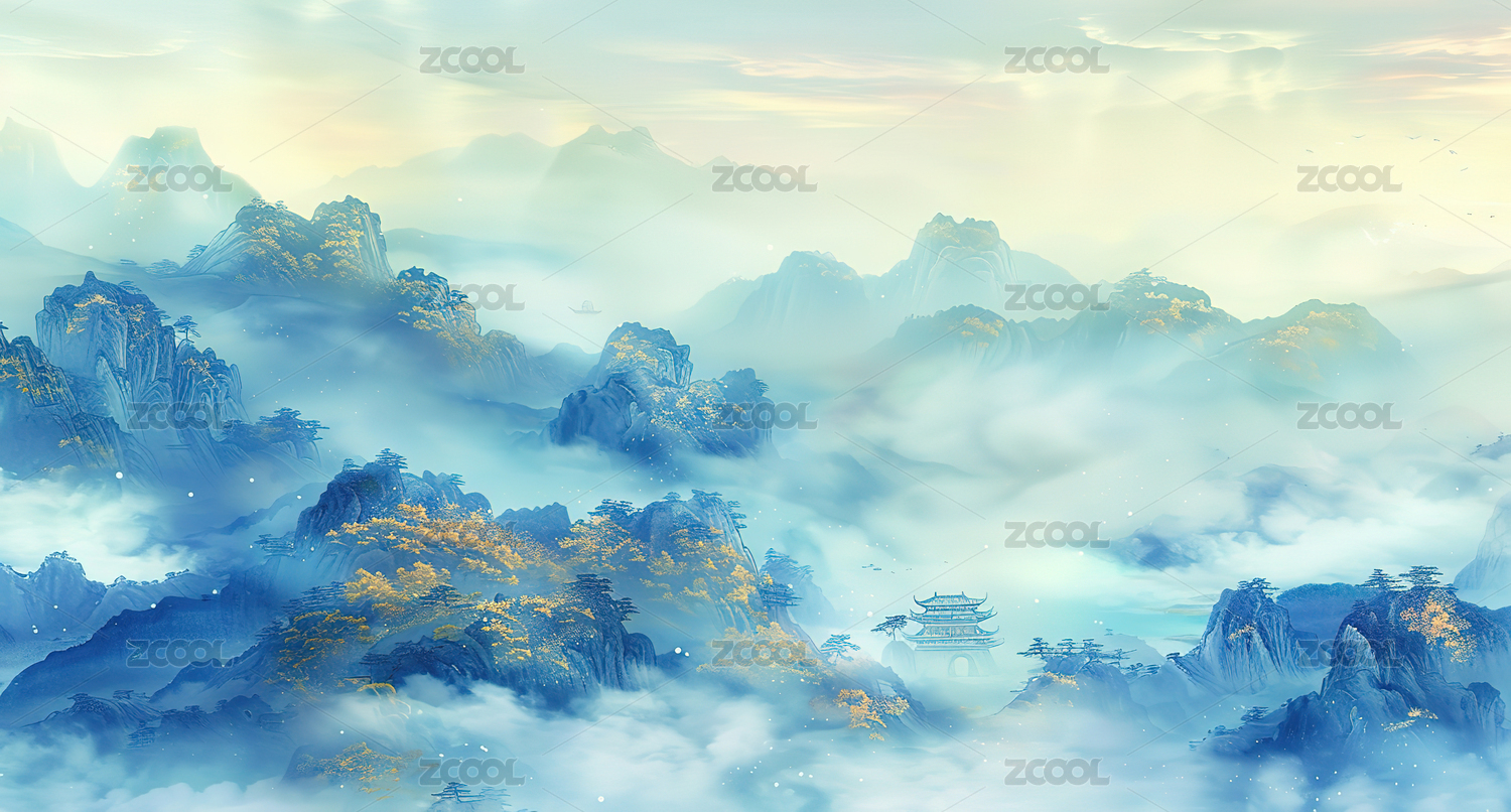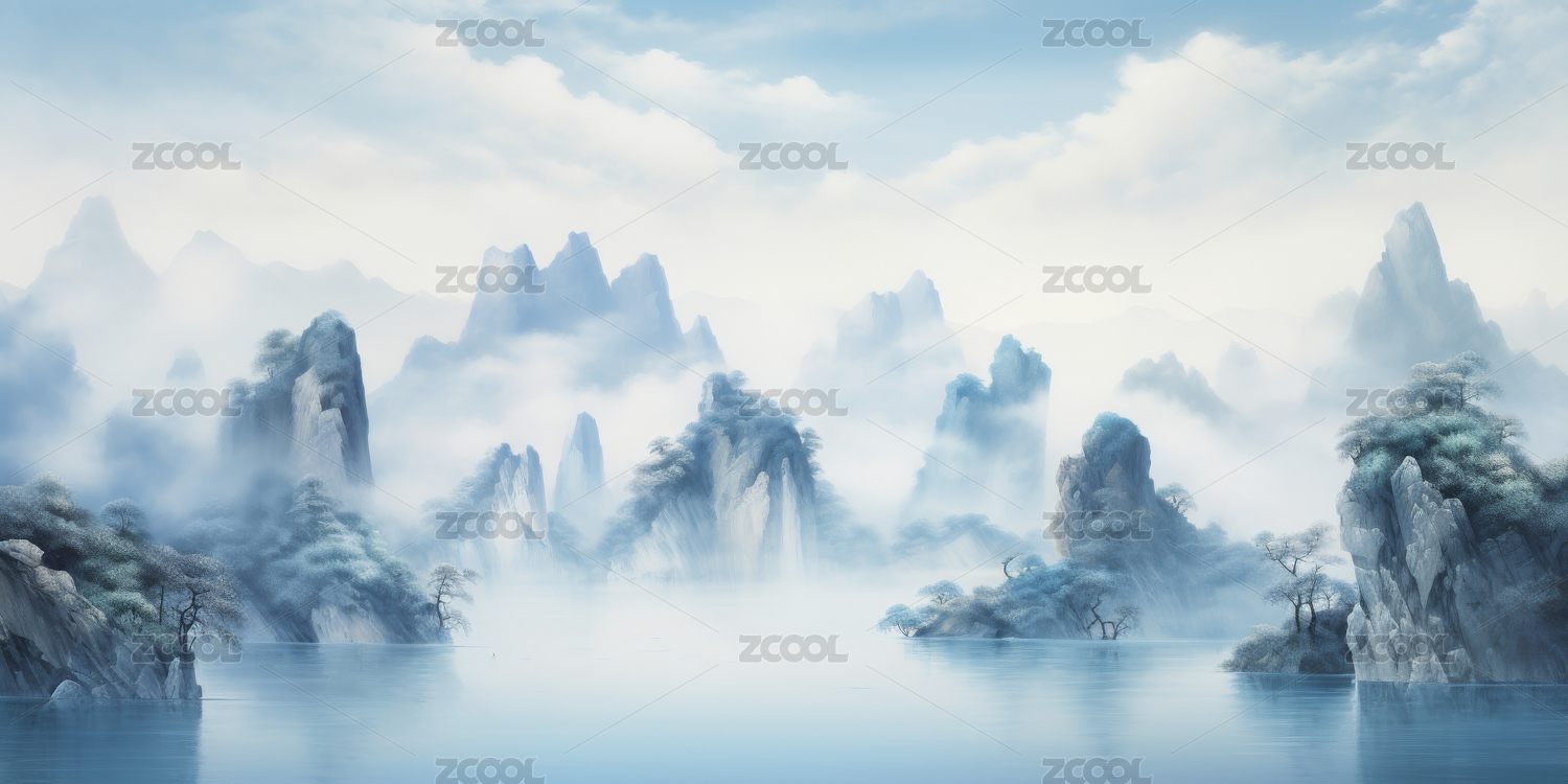 景色,宁静,梦幻,山脉,湖泊,天空,祥和,群山,蓝调,水墨画