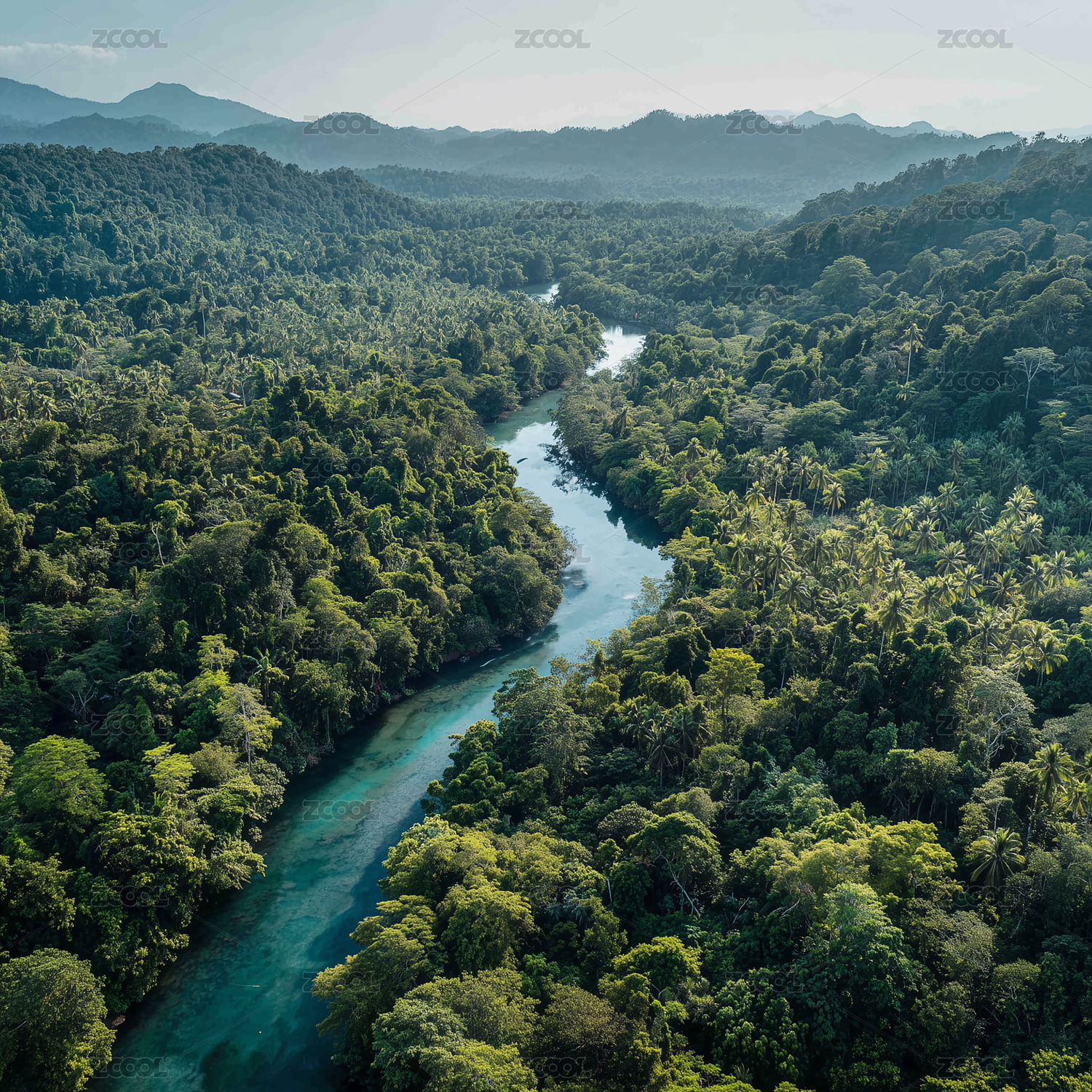 蜿蜒河流穿越茂密热带雨林