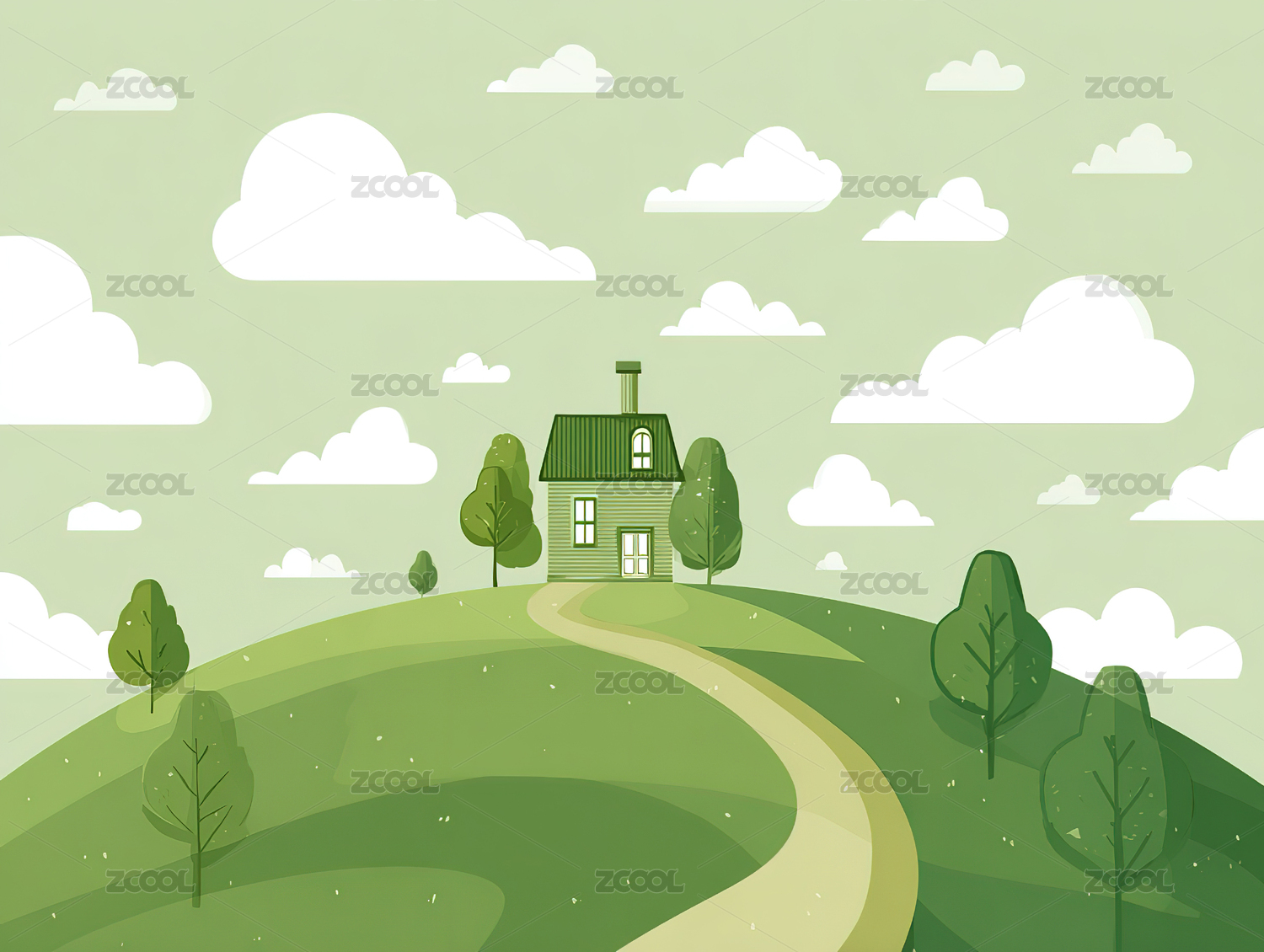 蓝天白云田园户外乡村小屋卡通插画