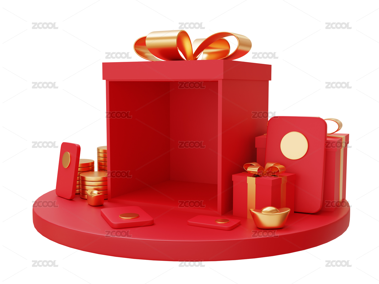 内空的红色蝴蝶结组合礼盒与洒落元宝素材