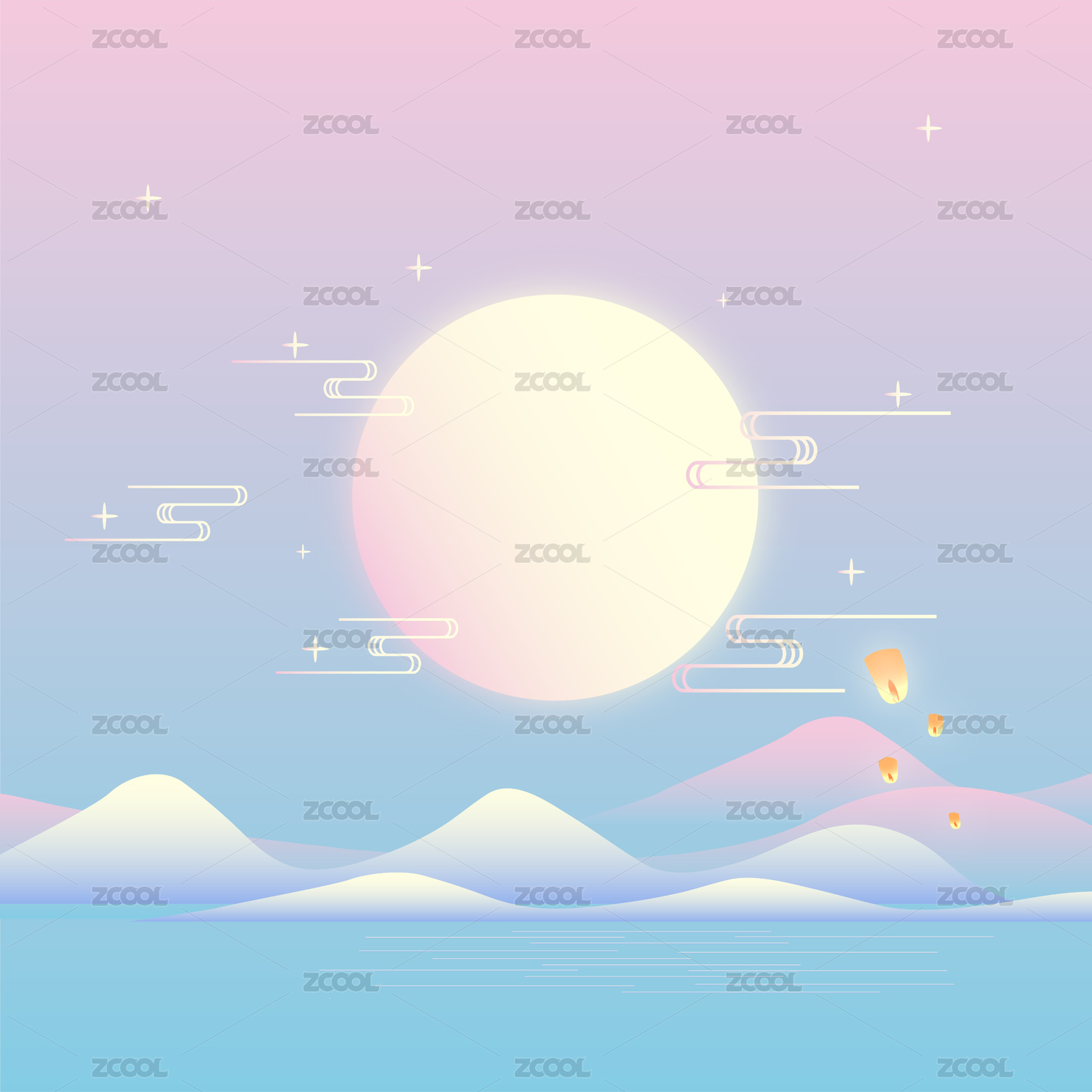 中秋节孔明灯夜景矢量插画