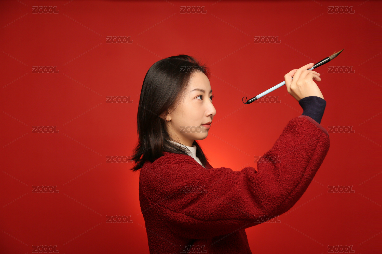 身穿红色外套的中国女孩在红色背景墙前使用毛笔