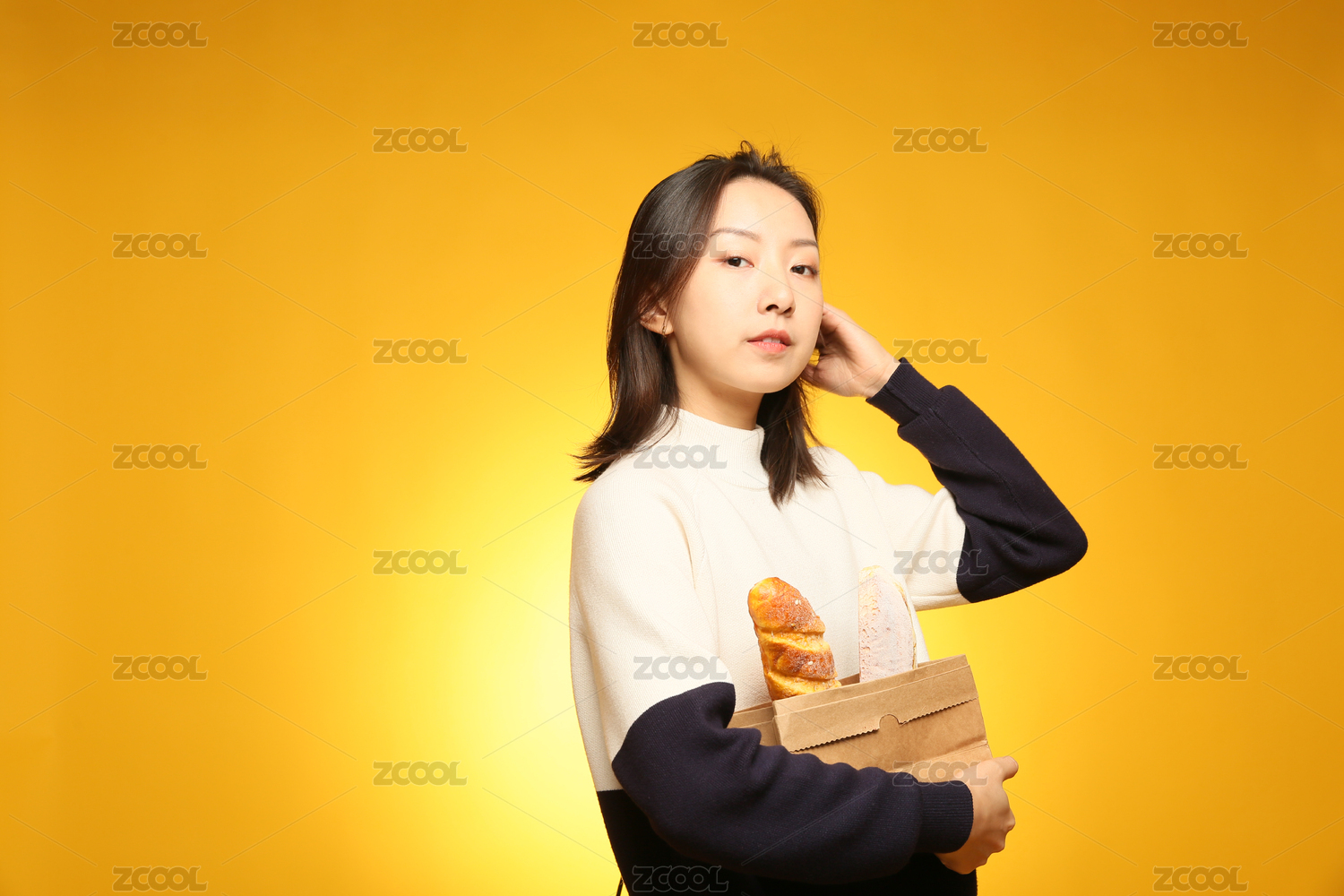 一名美丽可爱的中国女孩站在黄色背景墙前面带微笑