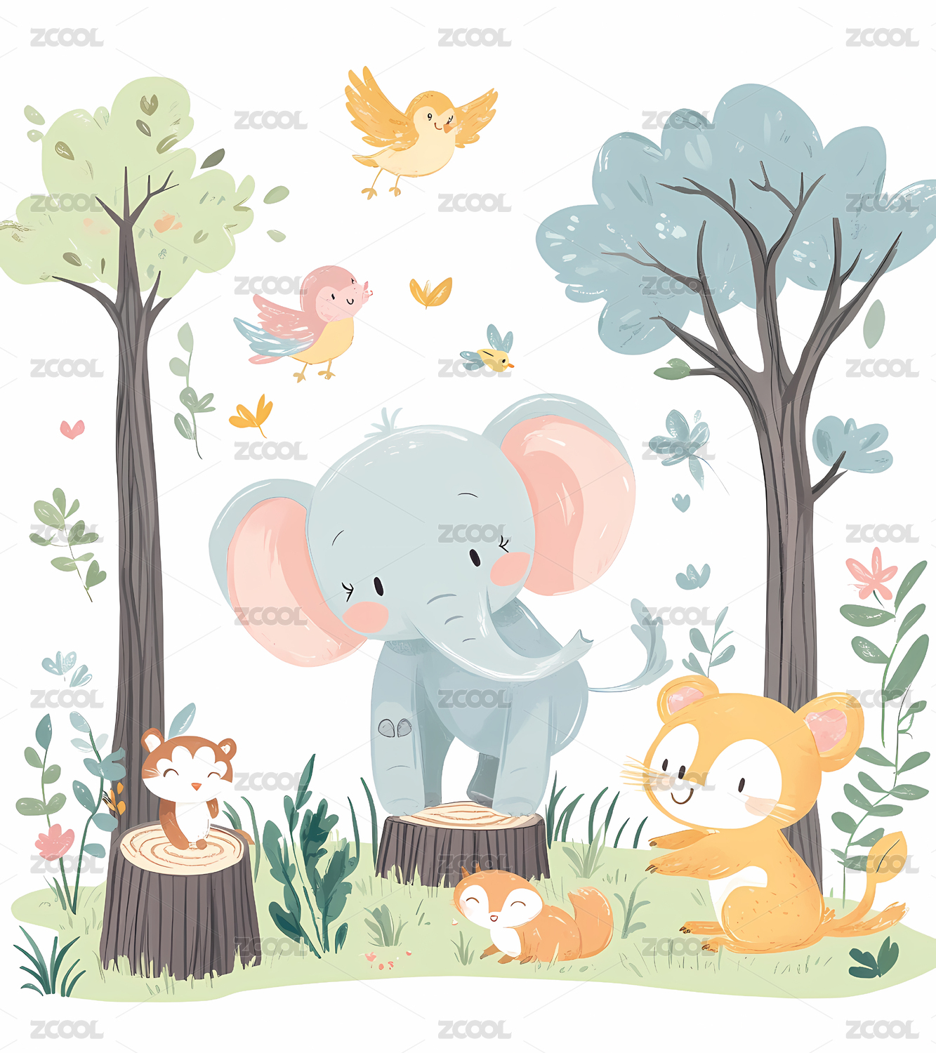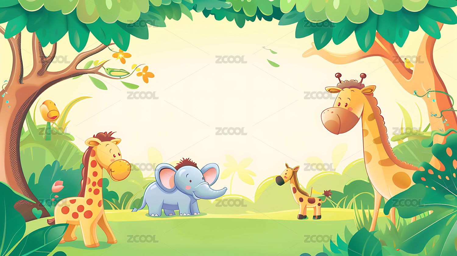 自然,狮子,长颈鹿,大象,动物,卡通,可爱,丛林,儿童,绘本