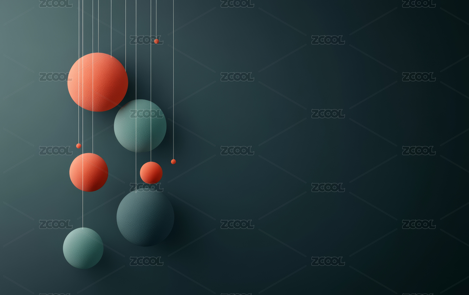 绿色背景上悬挂的彩色立体球体