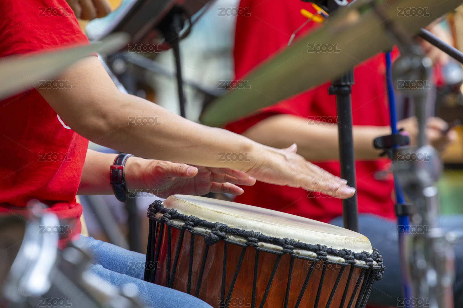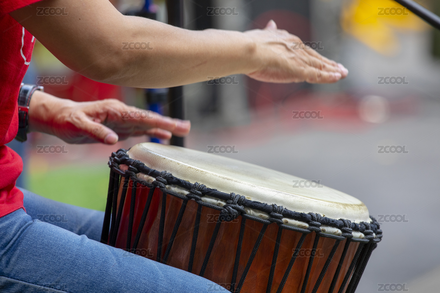 敲击传统鼓的表演者特写